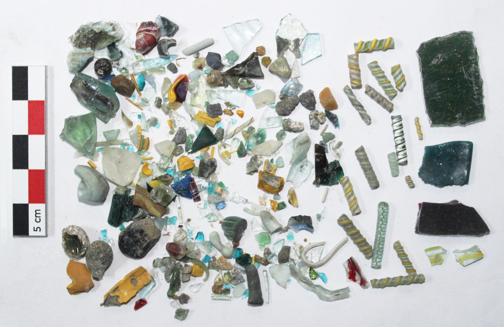 Lot d’artefacts issu du tamisage d’une unité stratigraphique de l’atelier de verrier du VIIIe siècle.