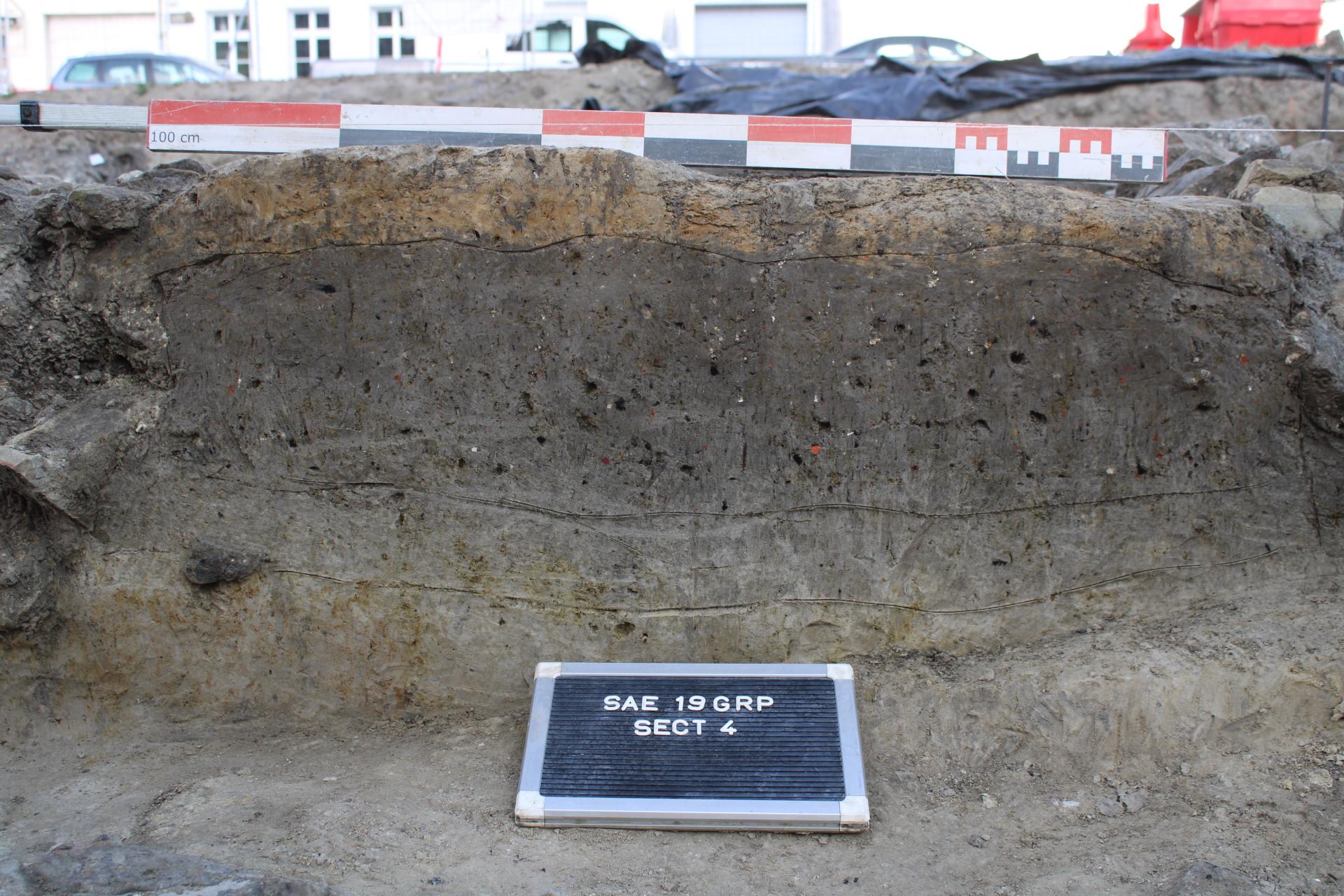 Vue de détail d’une coupe stratigraphique montrant les terres noires du IXe siècle.