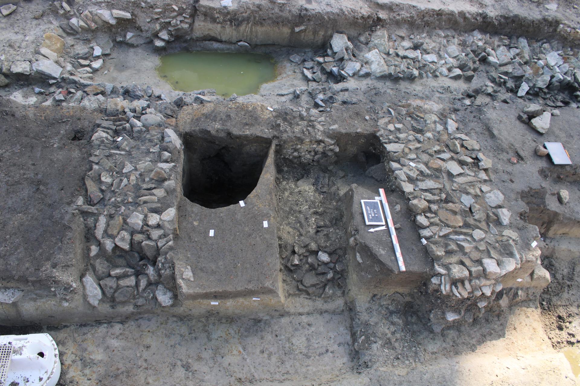 Au cours de l’abbatiat de l’abbé Dubois (1621-1673), l’abbaye de Saint-Amand subit de grands travaux de reconstruction, dont ne subsistent que la tour de l’abbatiale et le bâtiment d’entrée. Lors de ces travaux, la douve entourant les bâtiments abbatiaux est recreusée et voit sa largeur doublée par rapport à celle antérieure des XVe et XVIe siècles. Un pont en pierre est construit face à la tour abbatiale, vers 1625/1630. Partiellement observé lors du diagnostic de 2018, ce pont a pu être dégagé en grande partie et étudié en 2019. Construit sur deux arches, il est fondé sur des demi troncs de chêne soutenus par des pieux, parfaitement conservés. Outre son architecture à bossage caractéristique, il se démarque par un aménagement de pont-levis, assez inhabituel pour son époque de construction. Le dégagement des niveaux de la douve baignant la première arche du pont a permis de récolter un important mobilier céramique de la première moitié du XVIIe siècle, contemporain du fonctionnement de la grande cour voisine de l’abbaye. Pour cette dernière ont également été dégagés plusieurs tronçons des chemins en pavés reliant le bourg à l’entrée du clos abbatial ou menant vers le pont.
