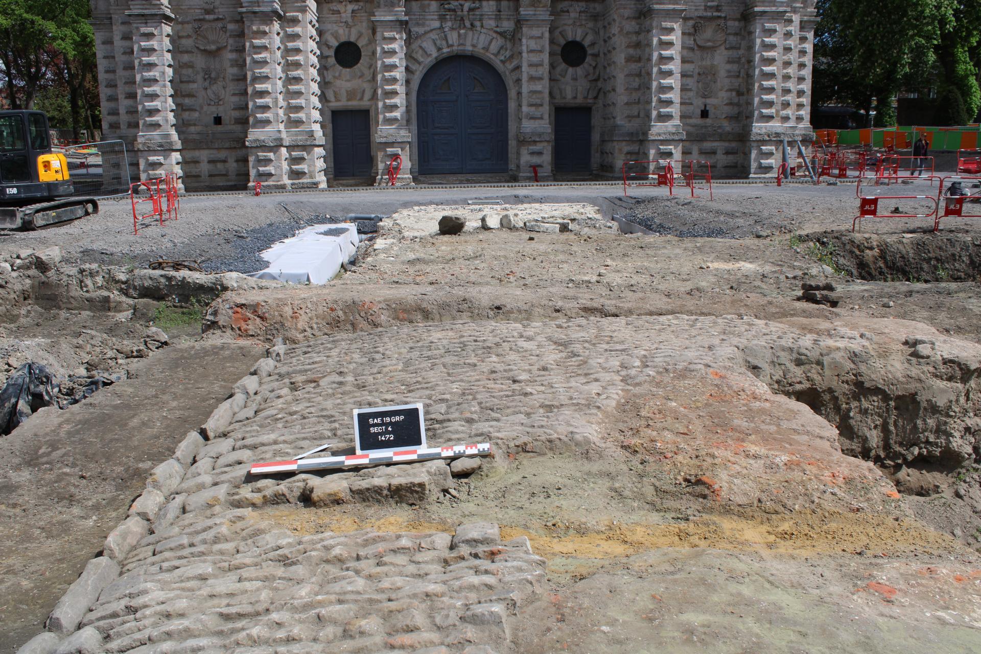 Vue des travaux d’aménagement de la Grand-Place, au moment de l’arrêt de chantier décidé par la DRAC/SRA (janvier 2018)