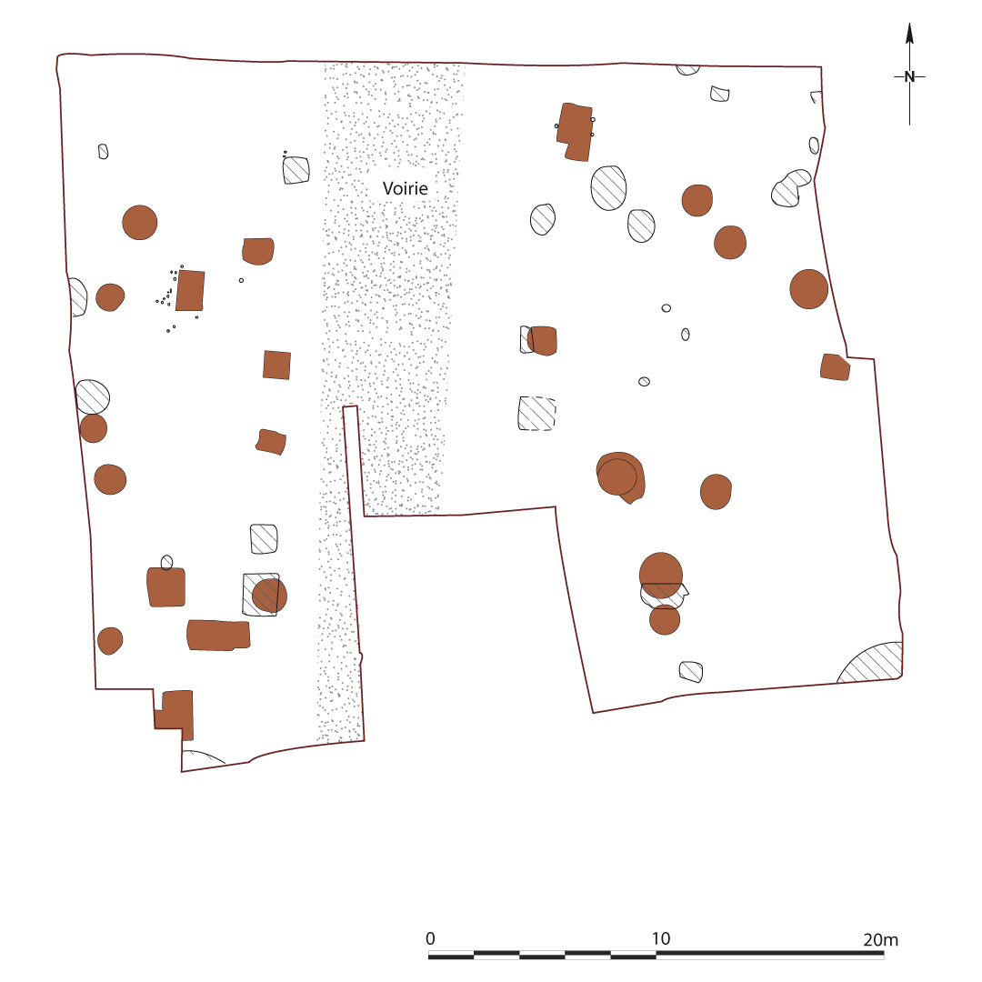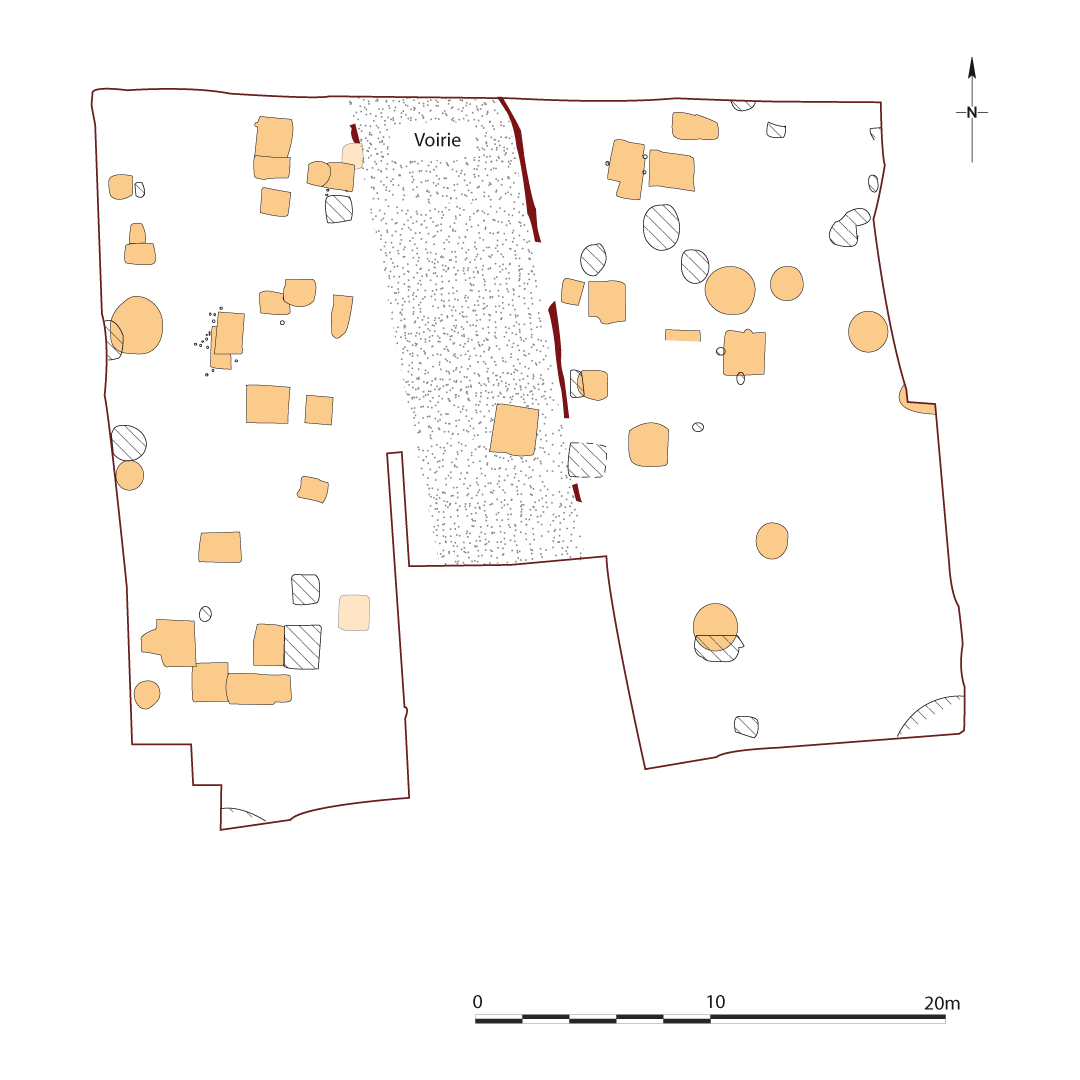 À partir du milieu du Ier siècle de notre ère, une voie orientée nord-sud est construite, de part et d'autre de laquelle sont creusées des fosses (environ 40). À l'ouest de la voie, le site comprend trois parties distinctes : un groupe de fosses au nord, un au centre et un dernier au sud. Au sein de chaque groupe, on trouve une ou plusieurs fosses de travail associées à une ou deux fosses dépotoirs. Les lots sont séparés par des espaces vides, correspondant probablement à des passages ou à des limites de parcelles.