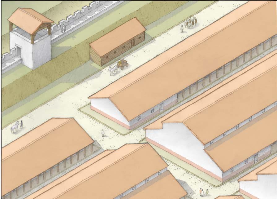 Une rue antique large de 4 m a été découverte. Elle est la première rue parallèle à la via sagularis (rue qui fait le tour de l'enceinte à l'intérieur d'un camp), dont le tracé connu se trouve à une trentaine de mètres. Elle est formée par des chaussées successives de graviers damés et bordée de caniveaux. En bordure de la rue se situe un bâtiment muni d'un portique. Avec une surface mise au jour de plus de 220 m2, ce bâtiment est si grand qu'il dépasse les limites de la cour actuelle. Les tranchées de huit murs perpendiculaires délimitent sur le terrain quinze pièces ; l'existence d'au moins cinq autres est probable. Les tranchées des murs témoignent de la récupération quasi complète des matériaux avant reconstruction du bâtiment selon un plan identique au premier. Les soubassements des murs étaient soit en pierre, soit en fragments de tuiles. Pour un segment d'un de ces murs, son élévation en briques crues a été retrouvée effondrée. Quelques pièces comprenaient des foyers et des sols construits : sol de mortier et sol de terrazzo (mortier de tuileau).