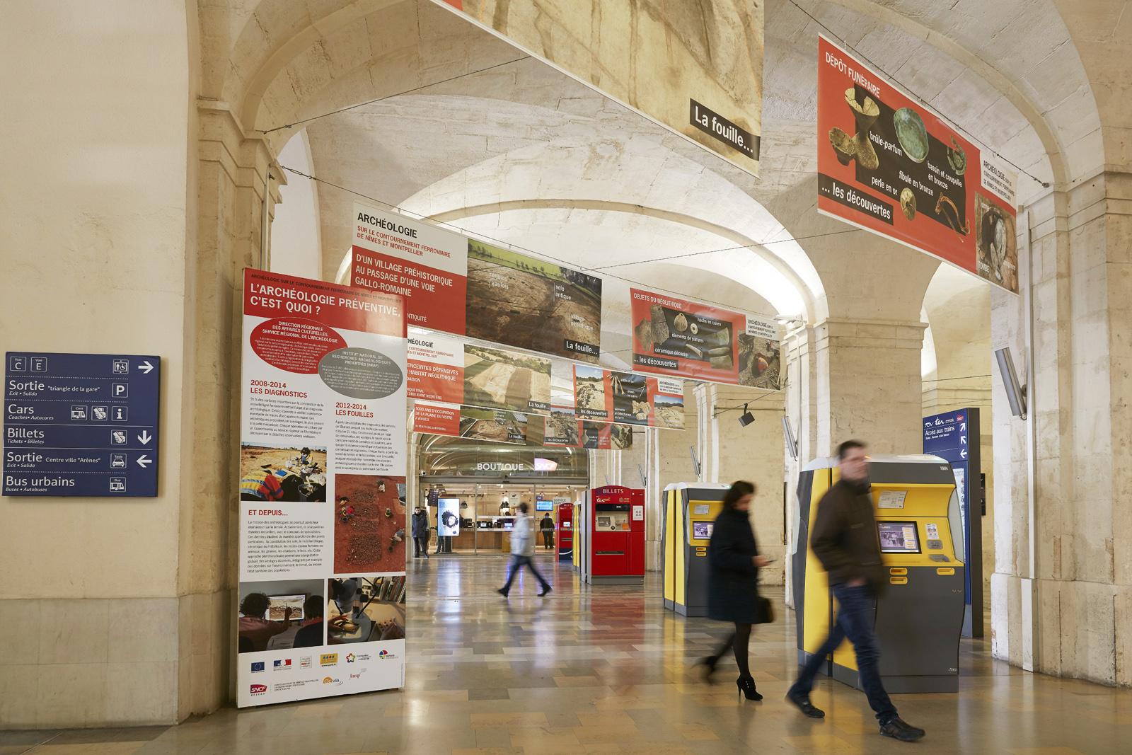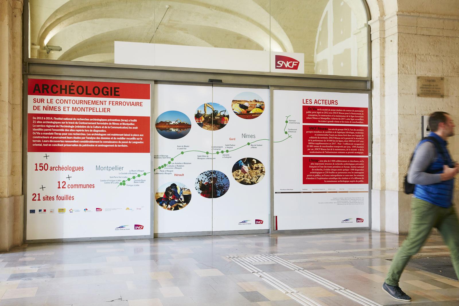 L’Inrap, Oc’Via et SNCF Réseau, en collaboration avec SNCF Gares & Connexions, proposent de partager avec les voyageurs les nombreuses découvertes faites pendant les fouilles archéologiques réalisées lors des travaux du Contournement ferroviaire Nîmes-Montpellier (CNM).