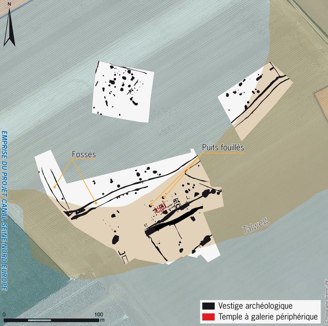 Sur les communes de Mesnil-Saint-Nicaise et Nesle (Somme). Préalablement à la construction d'une plateforme multimodale liée au canal Seine-Nord Europe, un diagnostic mené en 2009 par Véronique Harnay sur les communes de Nesle et Mesnil-Saint-Nicaise avait révélé l'emplacement d'un temple à galerie périphérique.