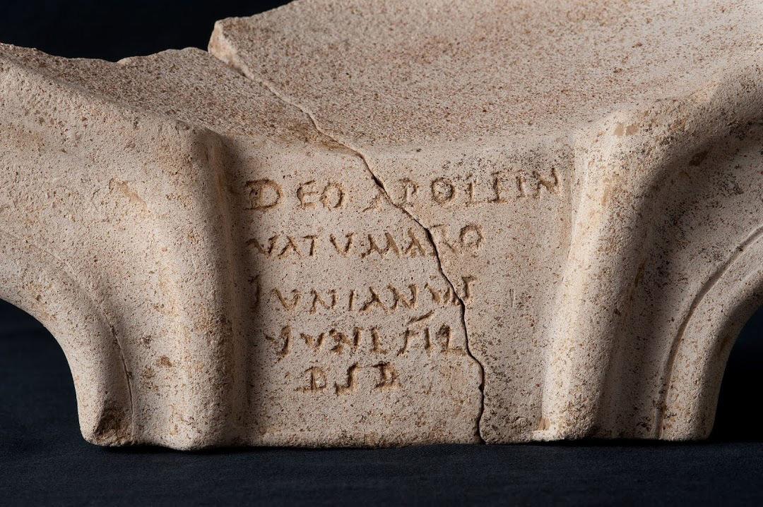 La découverte la plus surprenante est celle d'un grand mortier en céramique sur lequel est gravée une dédicace au dieu Apollon : Deo Apollin(i) / Vatumaro / Iunianus / Iuni fil(ius) / d(e) s(uo) d(edit), « Au dieu Apollon Vatumarus. Lunianus, fils de Lunius a donné [fait l'offrande] à ses frais ». Cette dédicace indique qu'Apollon faisait partie des divinités honorées dans ce lieu de culte. L'abrasion marquée de la partie inférieure du récipient montre qu'il a été utilisé pour râper ou broyer, selon toute vraisemblance dans le cadre des pratiques (médicinale ou culinaire ?) du sanctuaire.