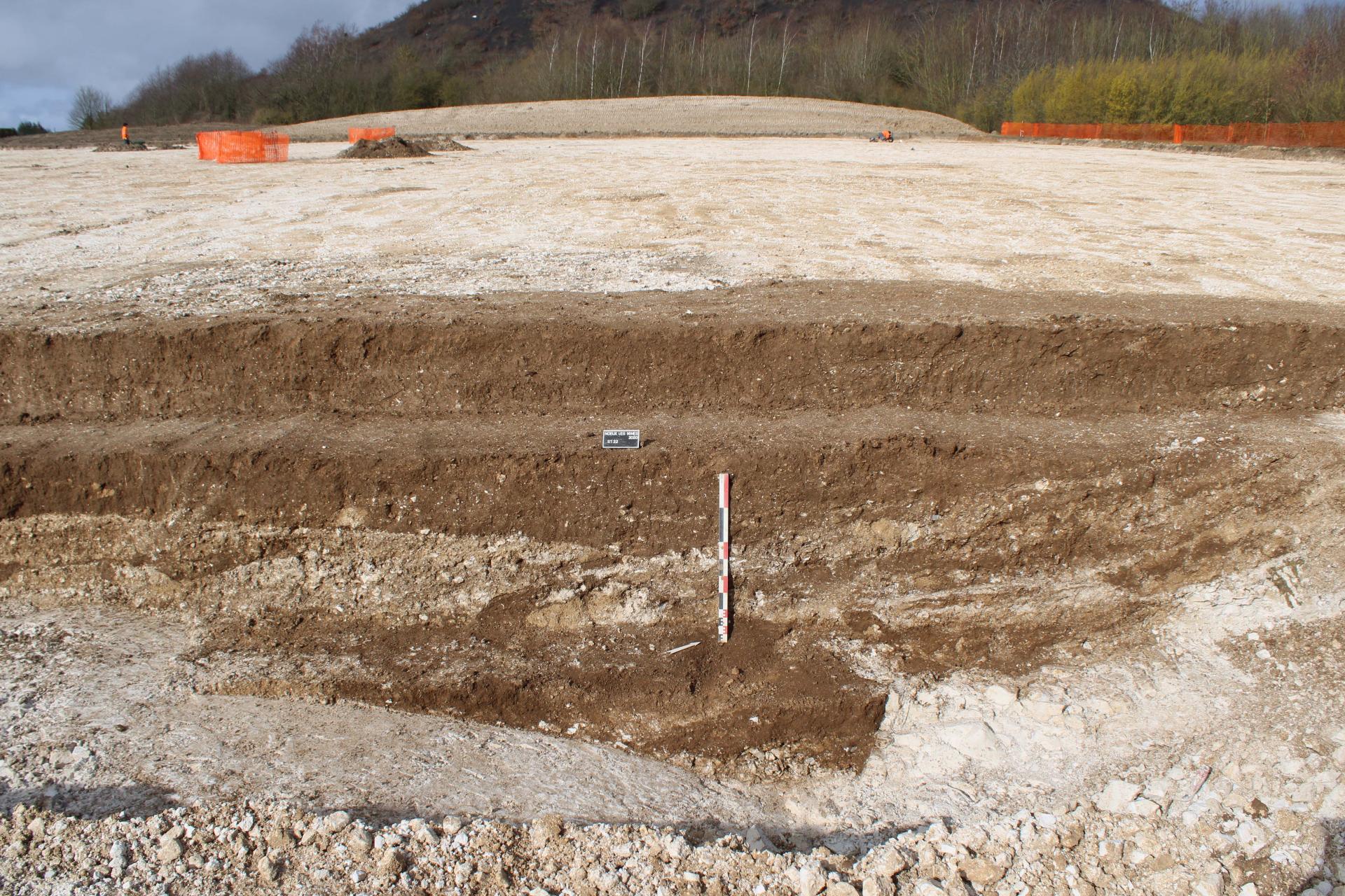 Zoom sur le comblement de la fosse d’extraction, on y aperçoit les rejets de calcaire