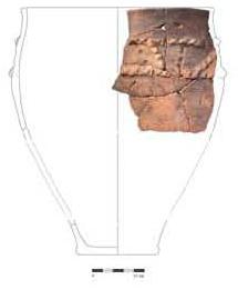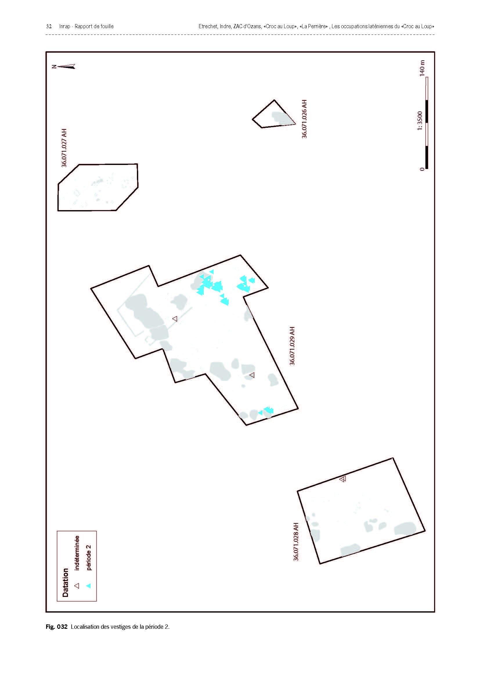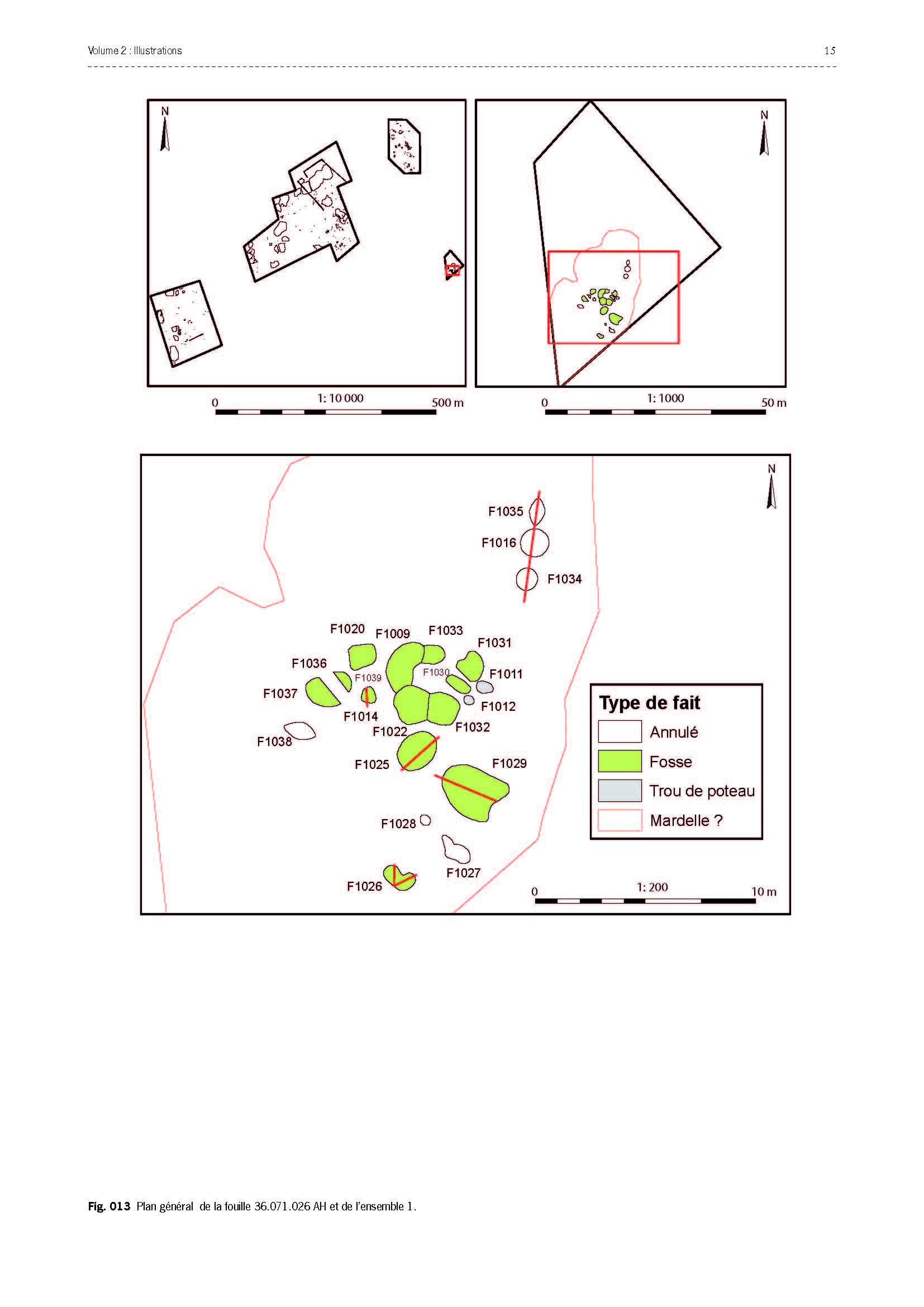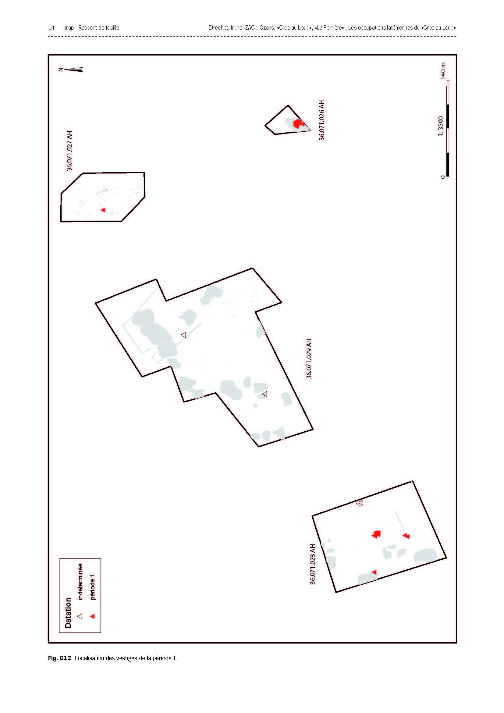 La période du premier âge du Fer-début du deuxième âge du Fer (510-450 avant notre ère), principalement présente dans la fenêtre correspondant au site 026 (période 1 ; fig. 12 et 13), est représentée par un ensemble de fosses qui, du fait qu'elles ont subi une forte érosion, offrent des plans très irréguliers. Ces fosses d'extraction ont permis de récolter un mobilier céramique permettant de compléter un corpus jusque-là très pauvre dans le département de l'Indre pour cette période de la Protohistoire.