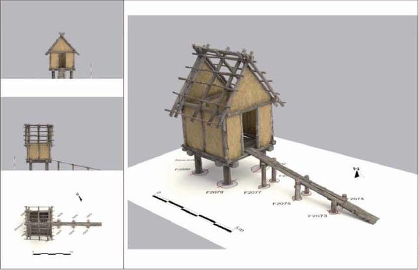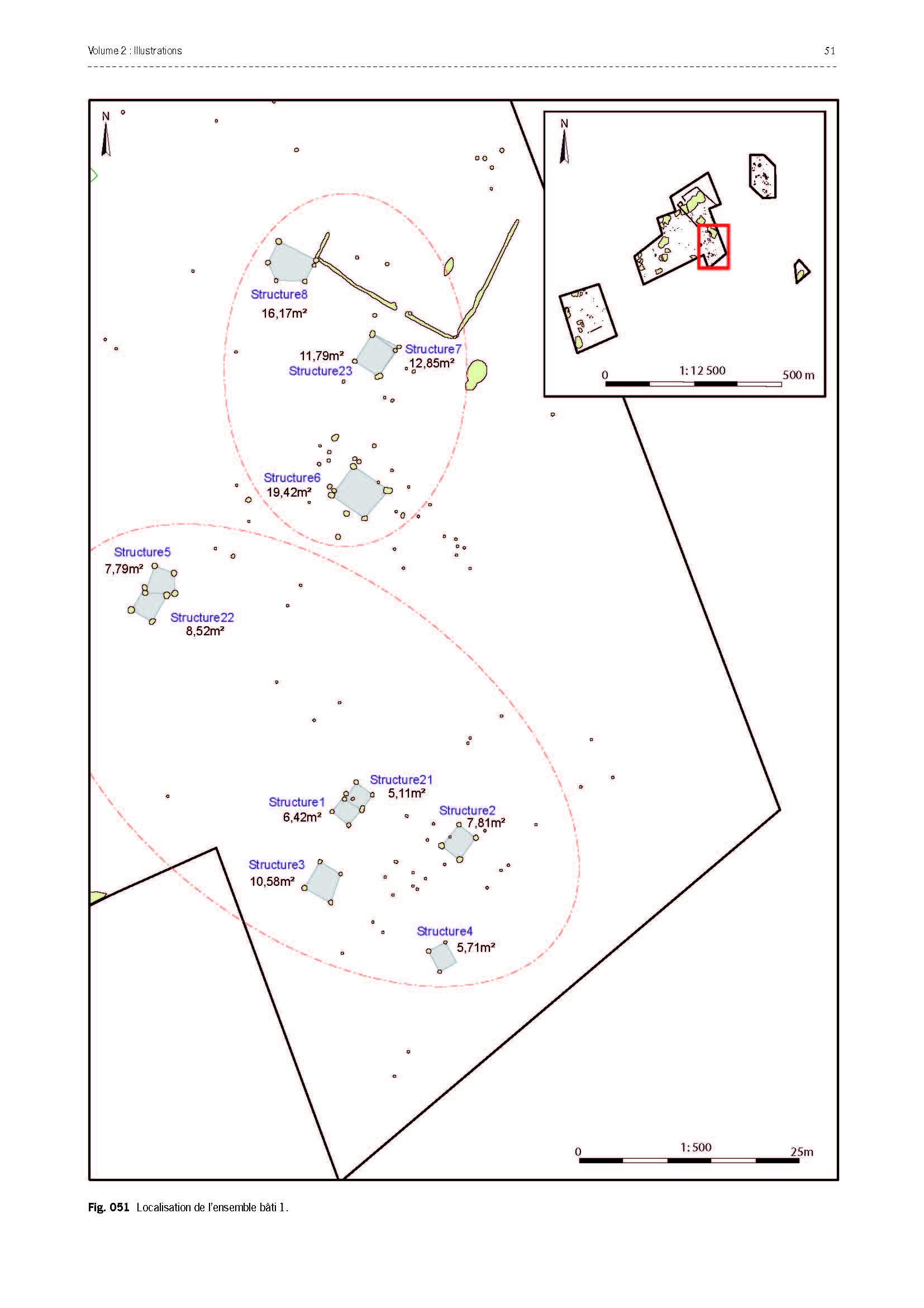 Immédiatement au sud, c'est un ensemble bâti de type ouvert correspondant à 12 unités architecturales qui a été mis au jour. Dans une zone de 2 500 m², il met en relation quatre bâtiments d'habitation localisés au nord et huit « greniers » (bâtiments fondés sur 4 poteaux porteurs) en partie sud. En outre, des vestiges confirment la perduration d'une activité d'extraction (d'argile ou de minerai de fer) durant cette seconde période d'occupation.
