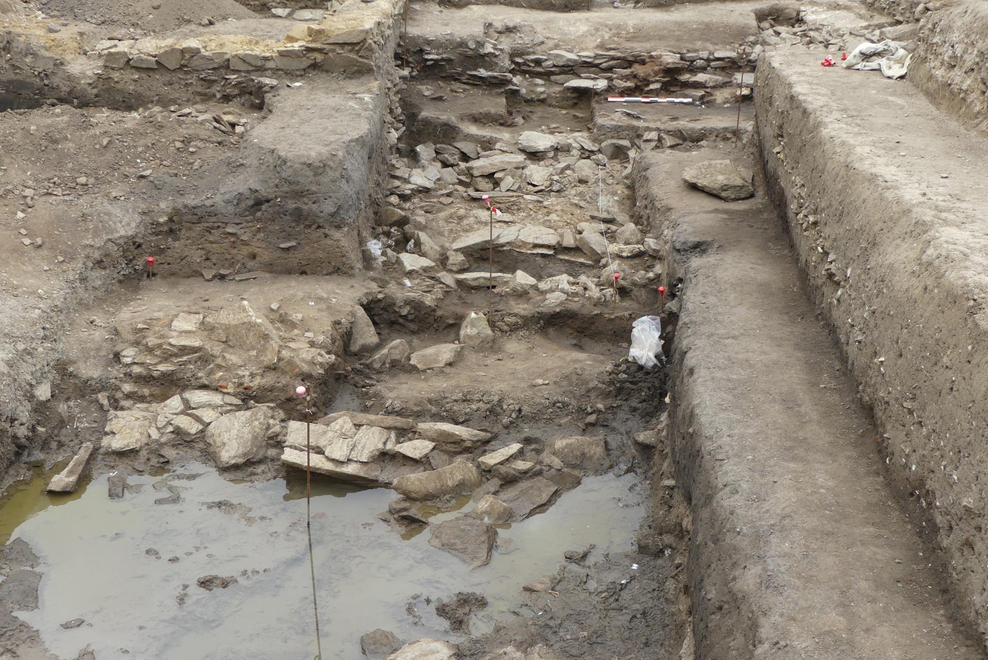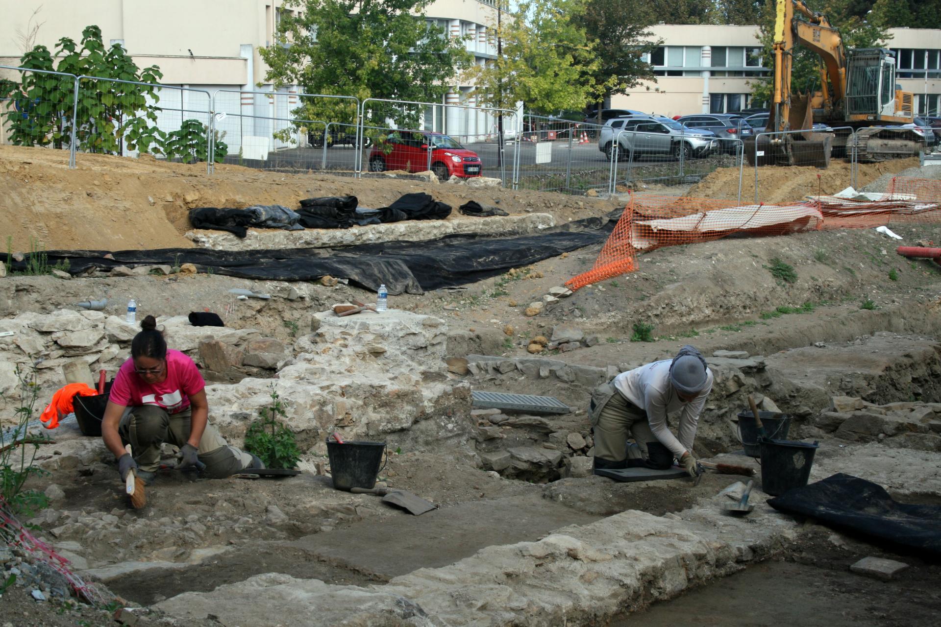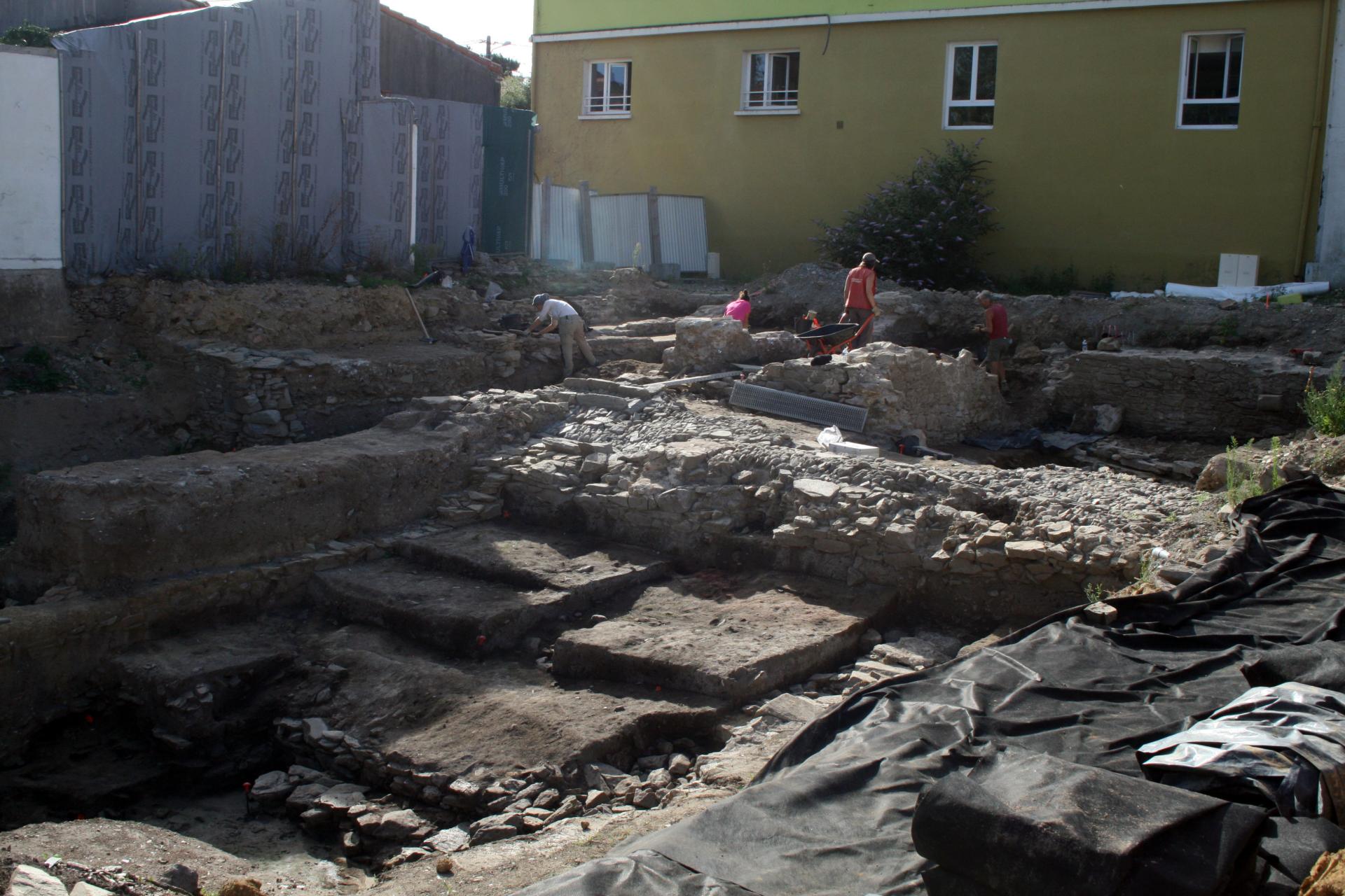 Fouille en cours de vestiges antiques. Au premier plan, traces d’une salle chauffée.
