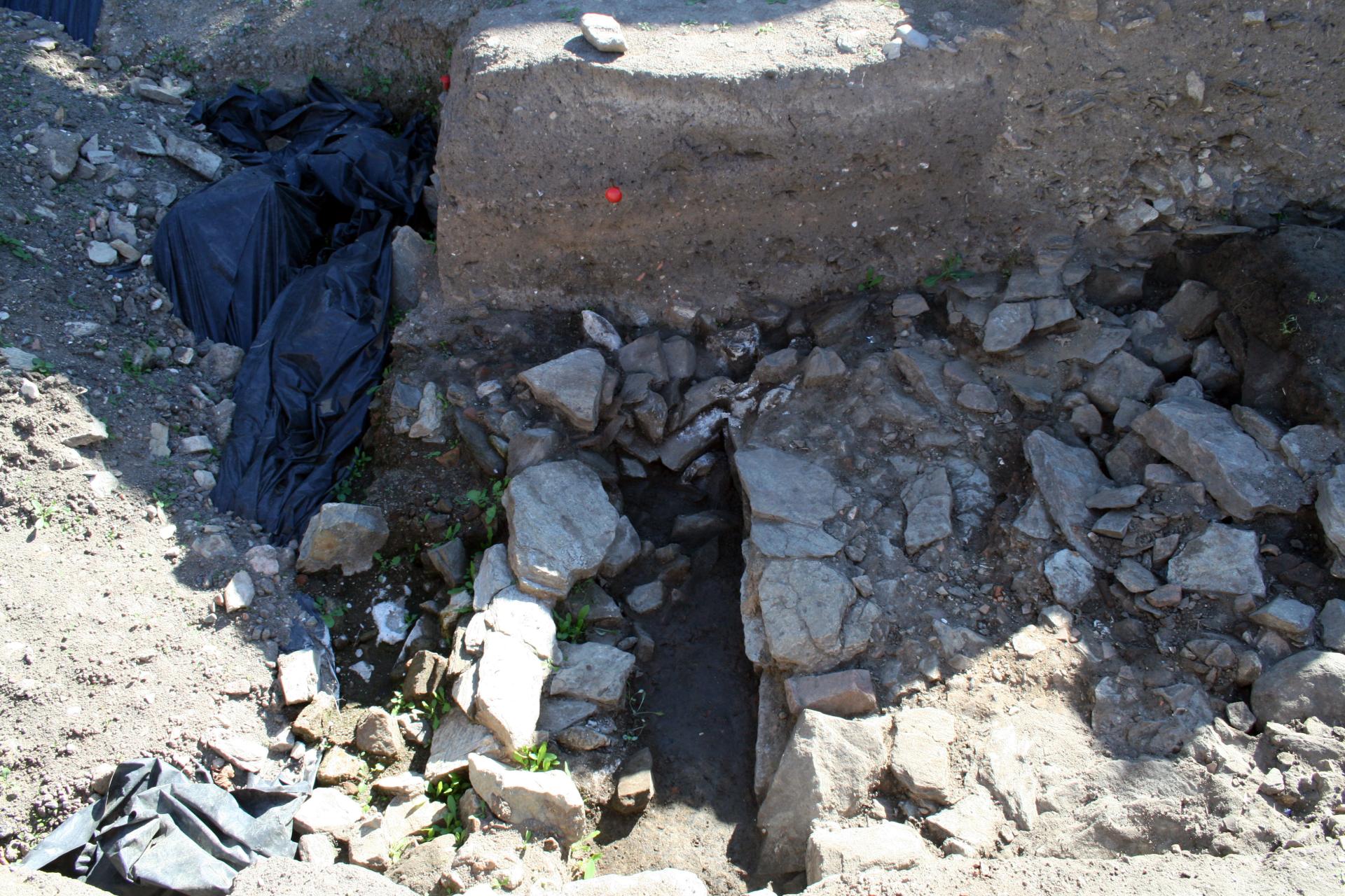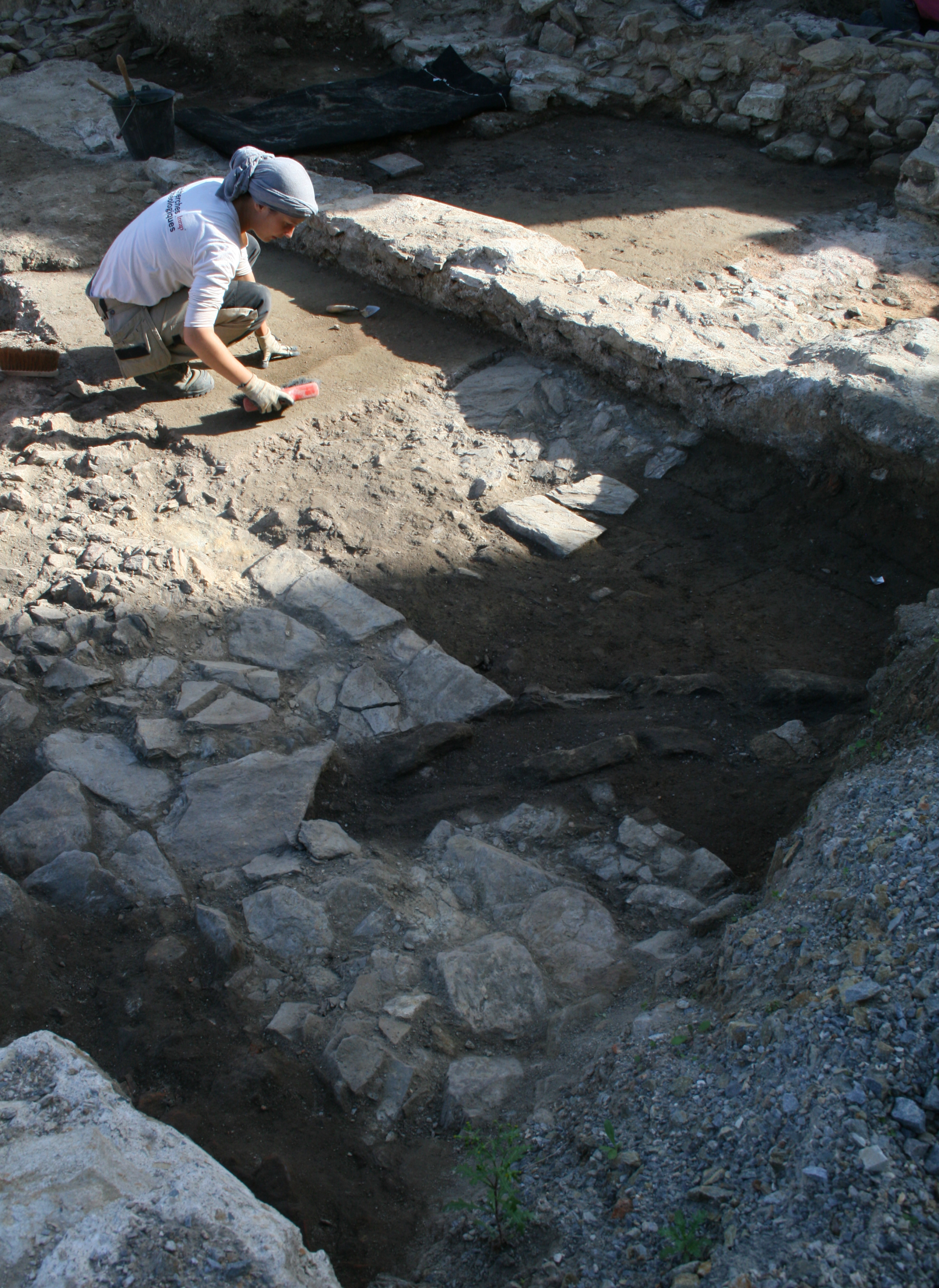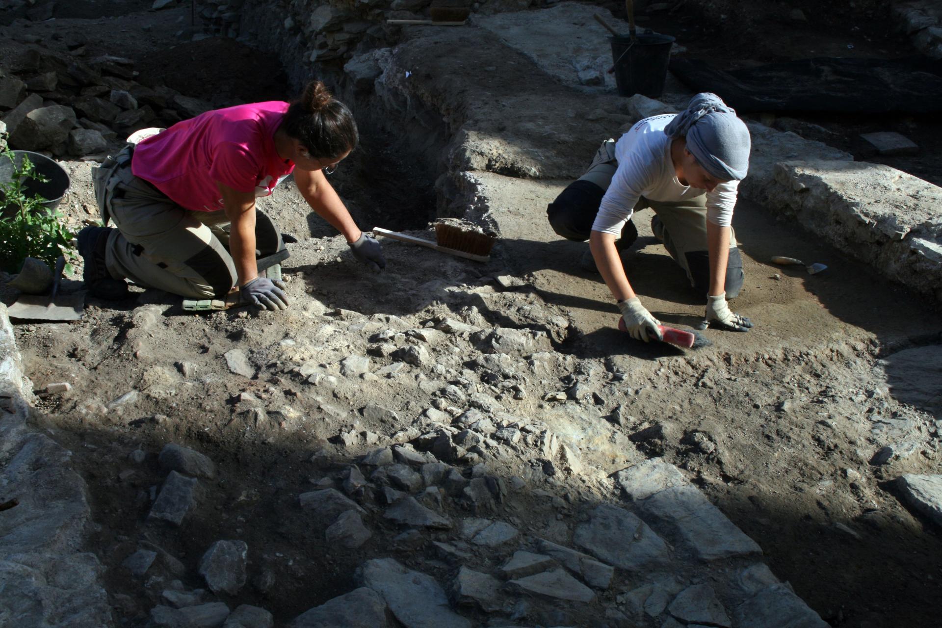 Fouille en cours de vestiges antiques. Au premier plan, traces d’une salle chauffée.