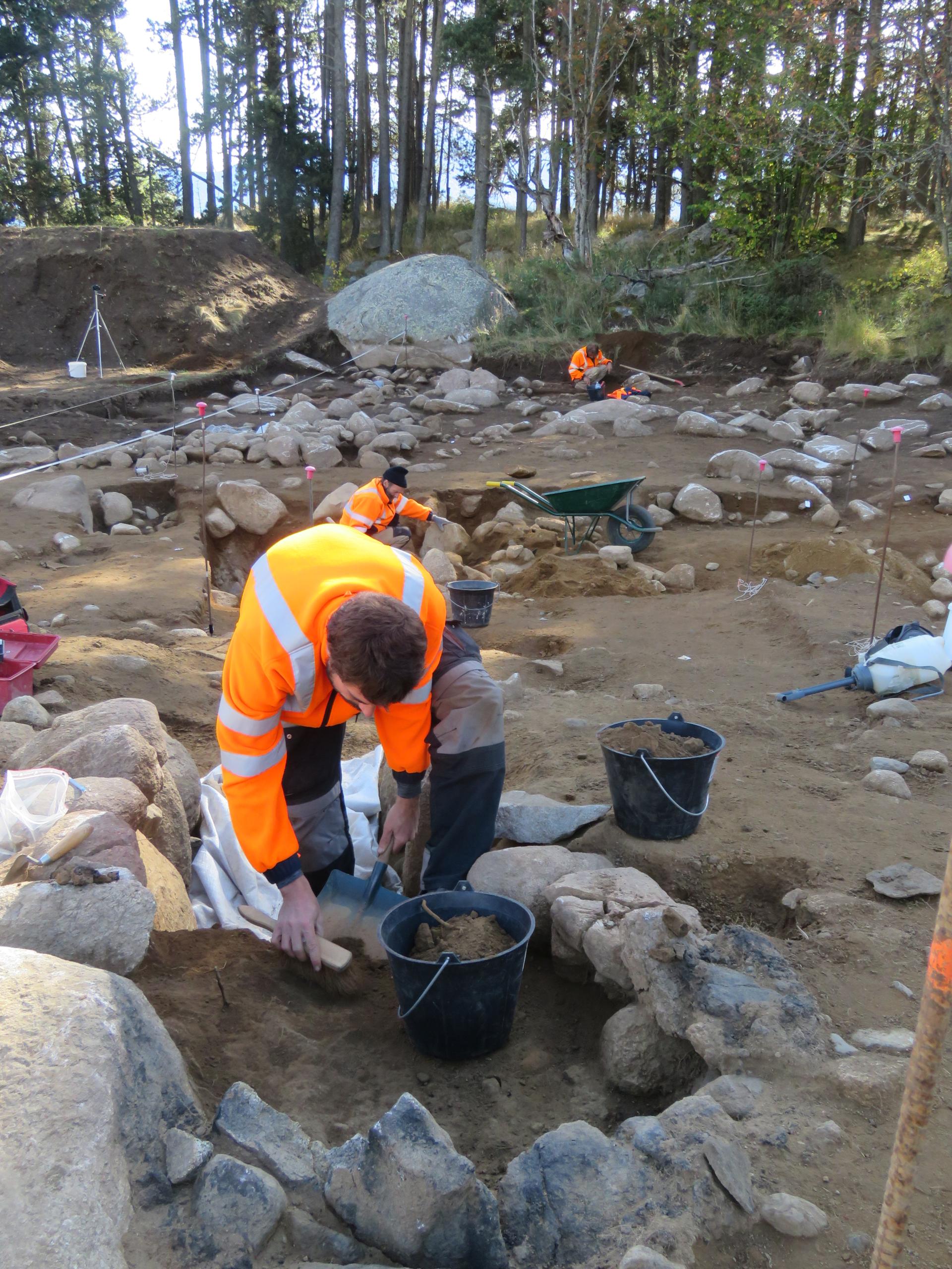 Au premier plan, le four à poix en cours de fouille, dans un contexte de montagne