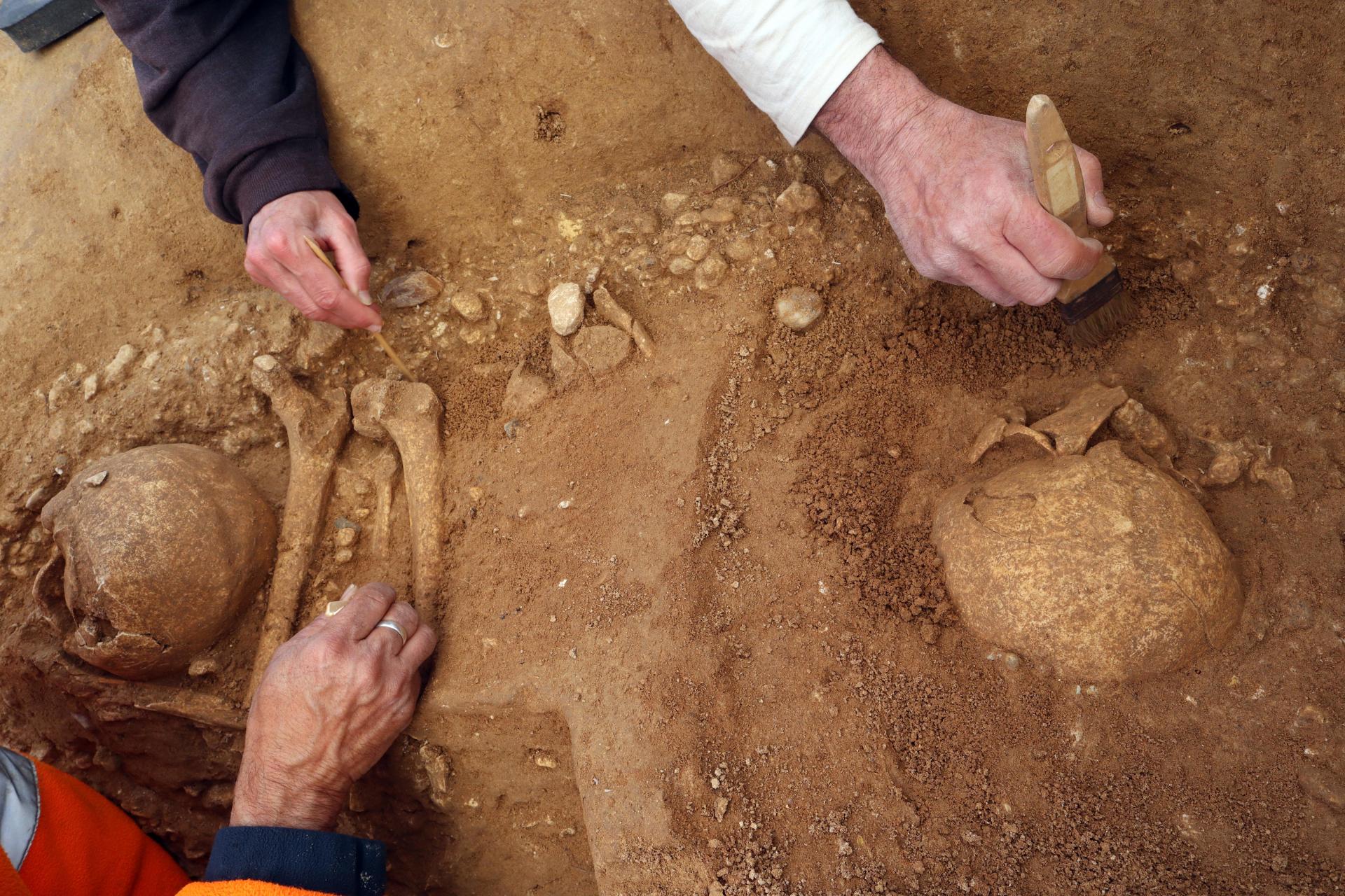 Sépulture mésolithique double en cours de dégagement par les archéo-anthropologues (Lot-et-Garonne).
