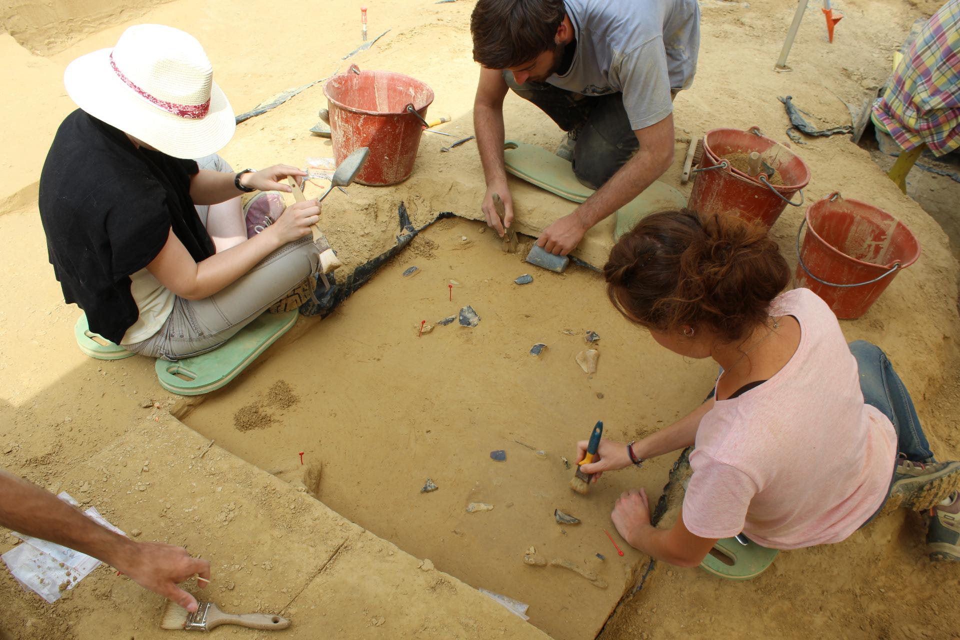 Fouille minutieuse d’une aire de rejet de déchets de silex et d’os de cheval.
