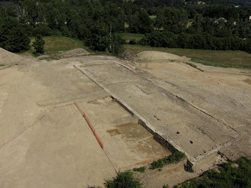 L'essentiel des découvertes se concentre sur deux secteurs. Un grand bâtiment d'une longueur de 52 m pour une largeur de 15 m est installé sur un espace tabulaire à l'amorce d'une grande pente. Il est posé sur le socle granitique, qui affleure à cet emplacement, par une fondation particulièrement soignée présentant, en moyenne, une largeur de 0,80 m. Le mortier utilisé dans l'élaboration des maçonneries est d'une facture remarquable. Dans l'angle nord-ouest de l'édifice, l'arénisation du granite a nécessité la stabilisation des constructions par l'ancrage des substructions sur près de 1,50 m. Ce sont là les vestiges les mieux conservés, les maçonneries étant très arasées ou dégradées sur le reste de la construction (présence d'une carrière de moellons moderne sur le côté sud du bâtiment). L'aménagement d'un accès a néanmoins pu être détecté sur le côté est. À l'intérieur du bâtiment, des socles de piliers ont pu être reconnus seulement sur la partie nord-occidentale. Il s'agit des restes des supports qui participaient au soutien de la charpente, compte tenu de la taille du bâtiment.