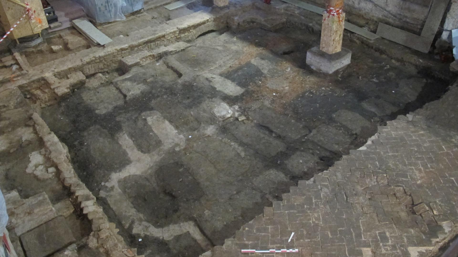 Alignement de fosses sépulcrales, arases de maçonneries et sol en tomettes dans la partie orientale de la nef.