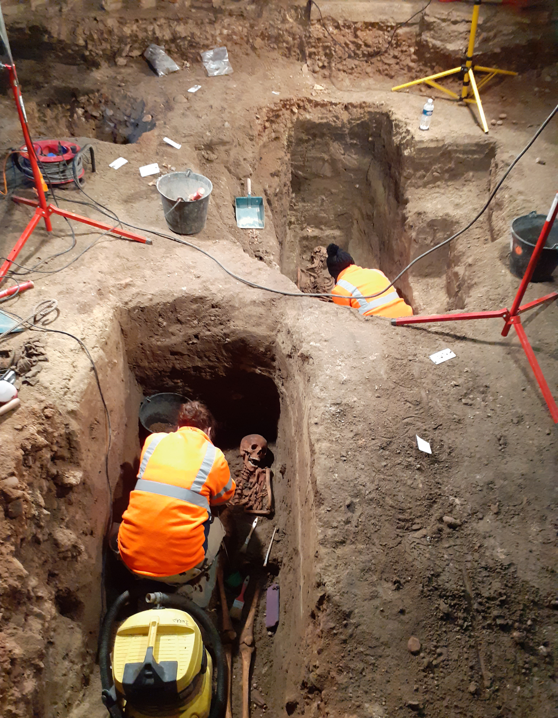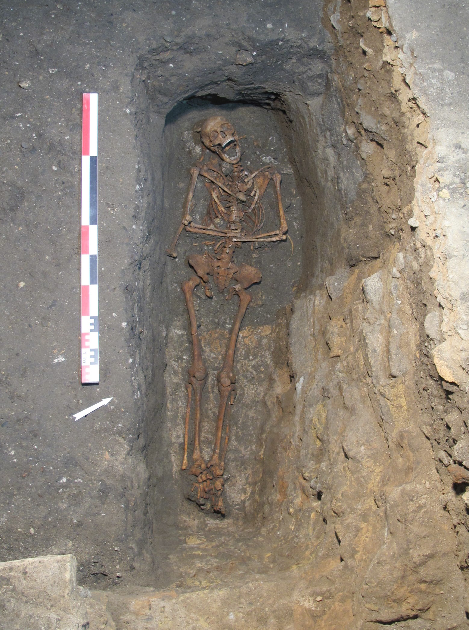 Les archéologues ont identifié une cinquantaine d’inhumations organisées en rang régulier, au centre de la nef. Des épitaphes du XVe siècle, insérées dans les murs, signalaient la présence de sépultures à l’intérieur de l’église. La fouille en cours et l’étude anthropologique à venir apporteront de nombreuses informations sur ces défunts du Moyen Âge : sexe, âge, catégorie sociale, hygiène de vie, pathologies (…) ainsi que sur les modes et pratiques d’inhumation et l’organisation spatiale des sépultures intra-ecclésiales.
