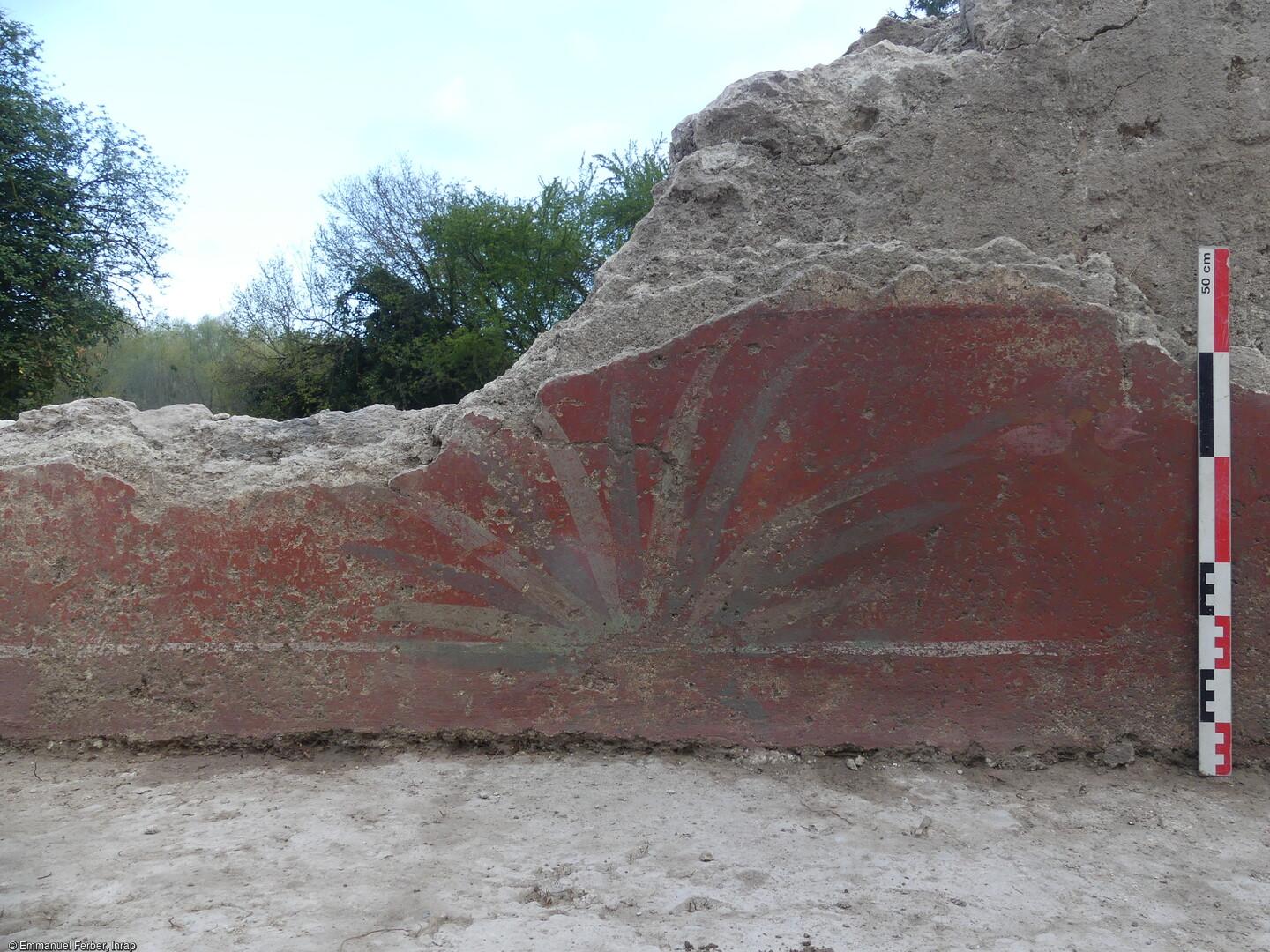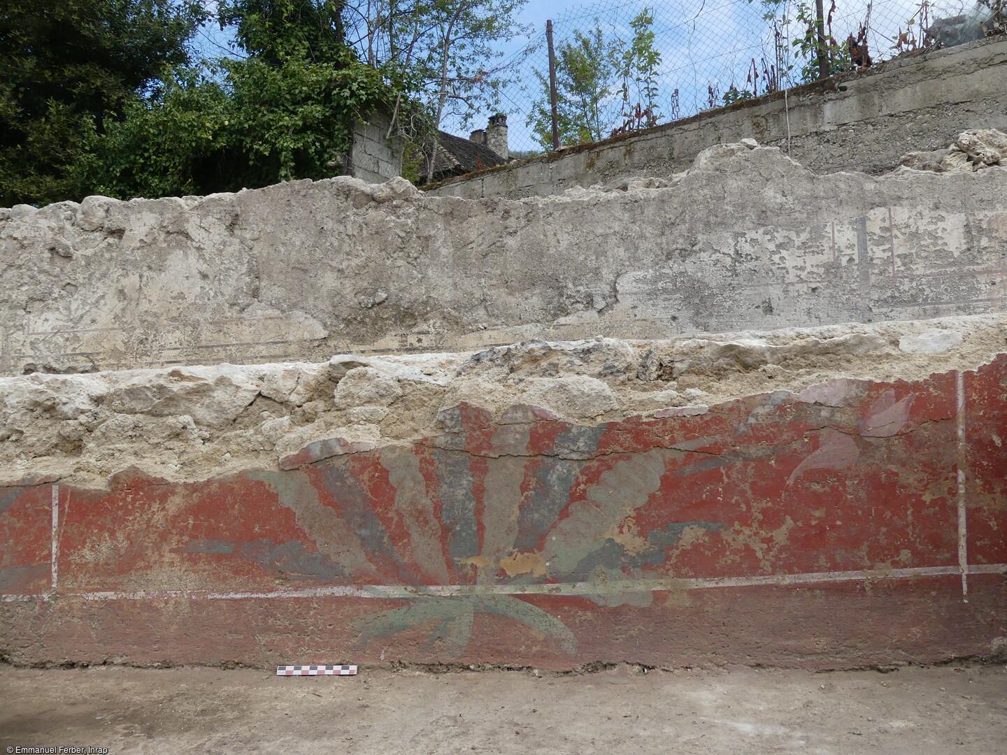 Enfin, un bâtiment aux sols faits de béton lissé et aux murs recouverts de décors peints couvre le secteur méridional. Les décors sont de deux ordres. Les murs d’un couloir sont recouverts d’un motif sobre (un fond blanc marqué d’encadrements rouges), alors que les parois d’une des deux salles conservent les traces d’une décoration plus soutenue. L’étude et le remontage des fragments recueillis n’est pas encore réalisé, mais a priori, il pourrait s’agir de panneaux noirs séparés par des bandes rouges décorés de motifs floraux, parmi lesquels un parterre de plantes était encore en place à la base des cloisons lors de la fouille. La fonction de ces locaux demeure plus incertaine. Si l’hypothèse de vestiaires restent envisageable, la possibilité de fonctions plus annexes (bibliothèque, boutique, réserve) semble plus appropriée.