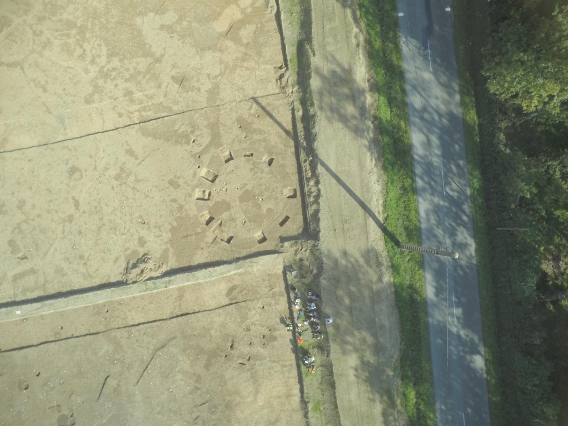 Vue aérienne sur laquelle apparaît un cercle funéraire de l’âge du Bronze.