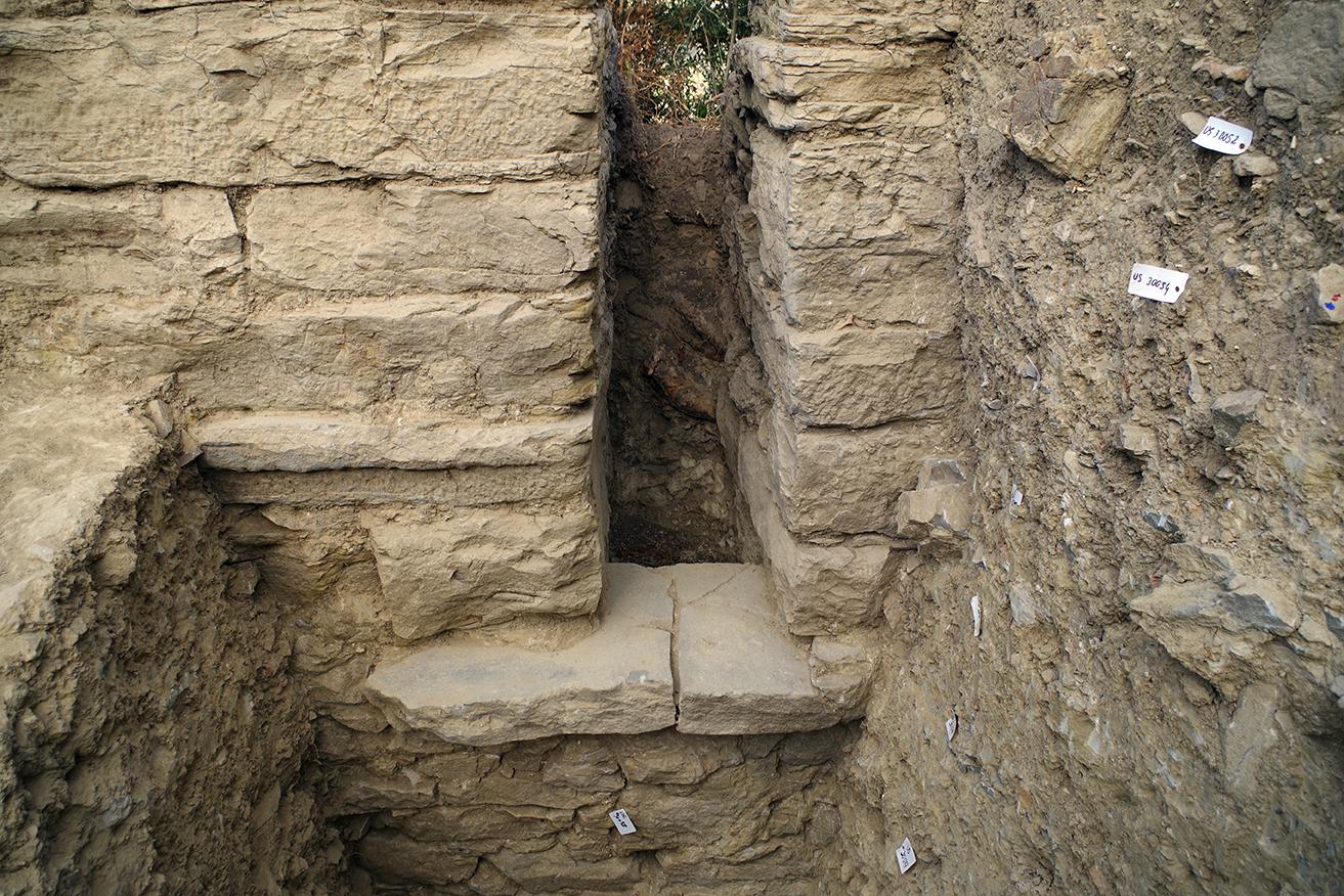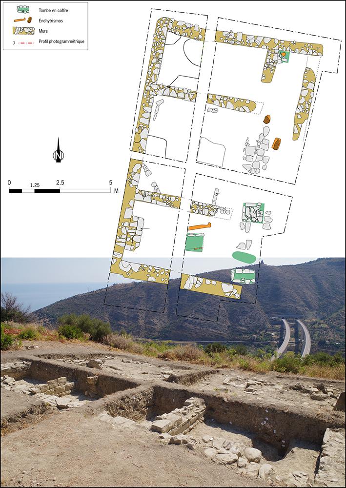 Dans le remblai, nous avons trouvé un mobilier abondant caractéristique d’un habitat de prestige : statuette, lampes, divers objets en métal. Après l’abandon et la destruction de l’édifice, à la fin de l’Antiquité, cet espace a été occupé par une petite nécropole, comportant essentiellement des tombes de jeunes et de périnataux. On y a trouvé des tombes à ciste et à enchytrismoi (en amphores), réalisées avec des bouts de vases de grandes dimensions ou des morceaux de tuyaux d’aqueduc.