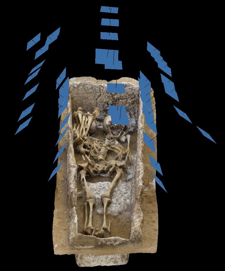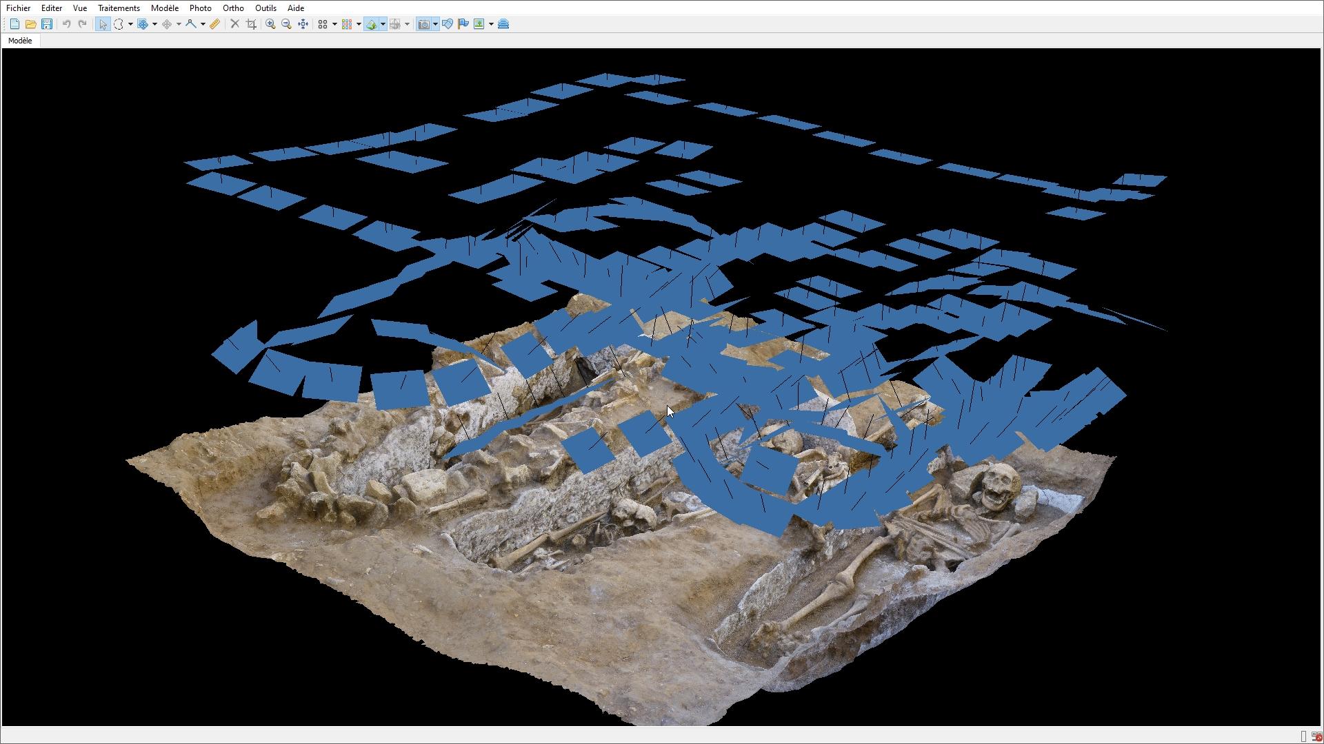 Ces estimations restent relatives : c’est toujours un point par rapport à son voisin. On ne peut pas faire de mesure tant qu’il n’y a pas de positionnement géographique Une fois que j’ai fait ce premier calcul qui a pour nom « aérotriangulation », je vérifie la position des caméras et de chaque prise de vue. Chaque rectangle bleu est une prise de vue, avec l’angle estimé. On constate une régularité dans les vues. Il y a une série verticale , une série à 45° et une série plus basse. qui fait le tour de la sépulture et une toute petite série en bas où l’on entre presque dans la sépulture et qui va donner des informations précises (le nombre de dents par exemple), ou montrer les parois des sarcophages, quand ils existent. Une fois que j’ai fait cette vérification visuelle, que je considère que le logiciel a bien calculé et positionné les points sans rien oublier, je suis sûr que l’enregistrement est bon et je peux continuer la fouille, même si je n’ai pas assuré le traitement jusqu’au bout. Cette étape est fondamentale, je dois tout de suite construire ce document qui est la première marche dans l’élaboration du modèle en trois dimensions. (fig. 12)