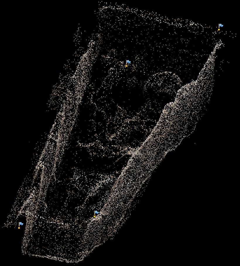 J’en reviens à mon premier nuage de points. Je l’associe aux cibles topographiques qui m’ont été données par le topographe. Pour ce faire je clique sur l’image et je fais le lien entre le pixel et sa valeur en x, y et z, et cela pour l’ensemble des points qui couvrent la zone. Lorsque les cibles sont renseignées, le logiciel propose un rapport d’erreur, qui est le décalage entre sa construction géométrique et la topographie. Je dois m’assurer que ce décalage est satisfaisant. Dans le cas contraire je compléterai mon relevé avec de nouvelle photos ou de nouveaux points. Je pourrais alors prévenir mes collègues que l’on peut démonter et aller en dessous.