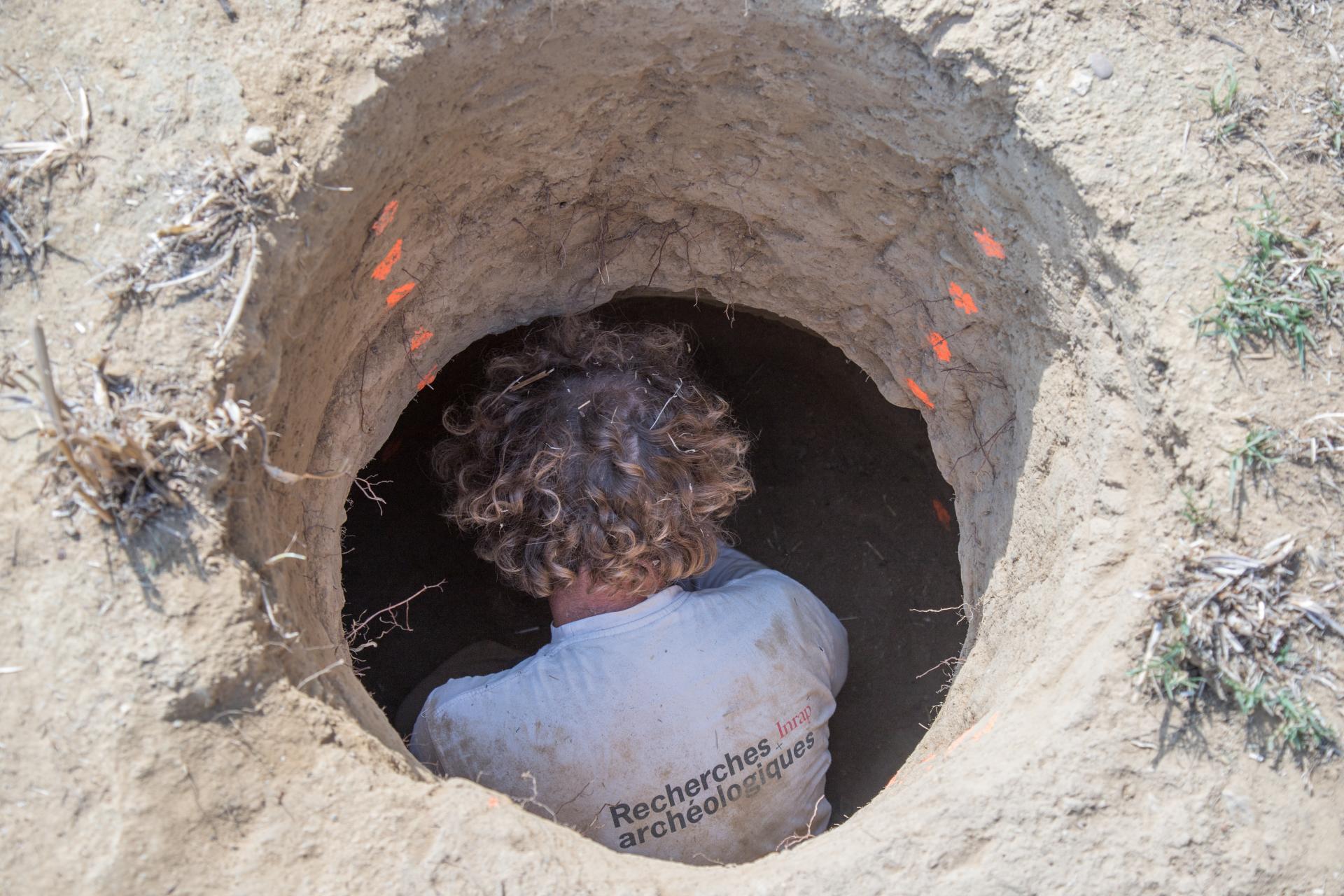 Silo en cours d'étude par un archéologue de l'Inrap. Il réalise différentes observations sur la nature et la stabilité du substrat.