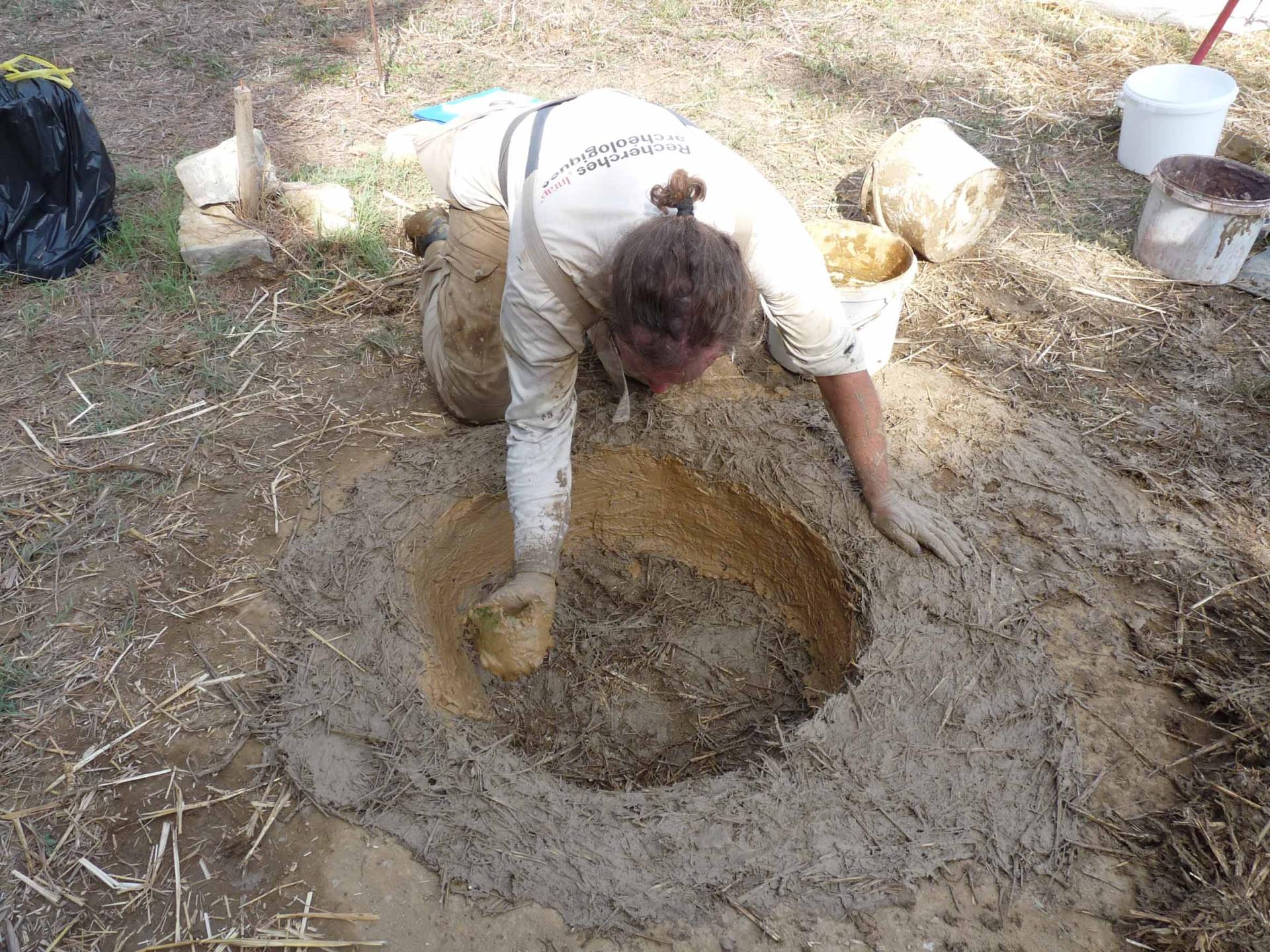 Un archéologue de l'Inrap projette le mélange terre humide et paille destiné à boucher le silo.