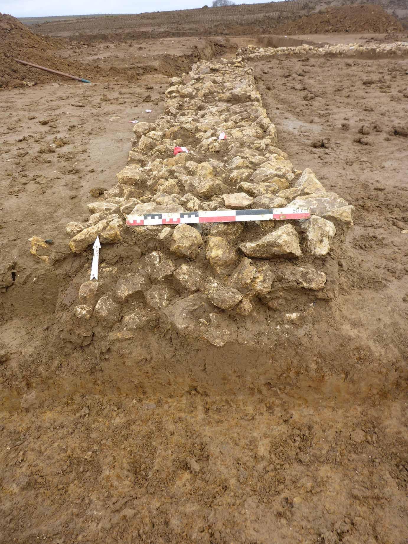 Vue de la tranchée de fondation empierrée dans le bâtiment gallo-romain de type grange.