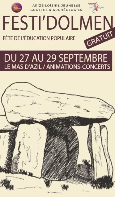 Du 27 au 29 septembre au Mas d’Azil, les associations Arize Loisirs Jeunesse et Grottes&Archéologies vous invitent à FESTI’DOLMEN, un voyage dans le temps pour découvrir les dolmens et le patrimoine néolithique local, thématiques de ces journées « Éducation Populaire » 2019.