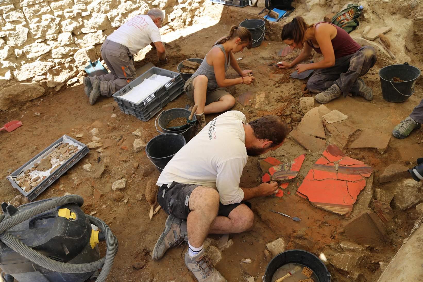Pendant la campagne de fouilles de 2014, les restaurateurs du musée sont intervenus sur le site de la Verrerie à Trinquetaille pour sauvegarder les nouveaux éléments mis au jour par les archéologues : consolidations in situ de pavements (sol en mortier de tuileaux, vestiges de mosaïques) ou d’éléments pariétaux ; dépose de sol en mortier de tuileau ; dépose des grands éléments d’enduits peints conservés encore sur les parois...