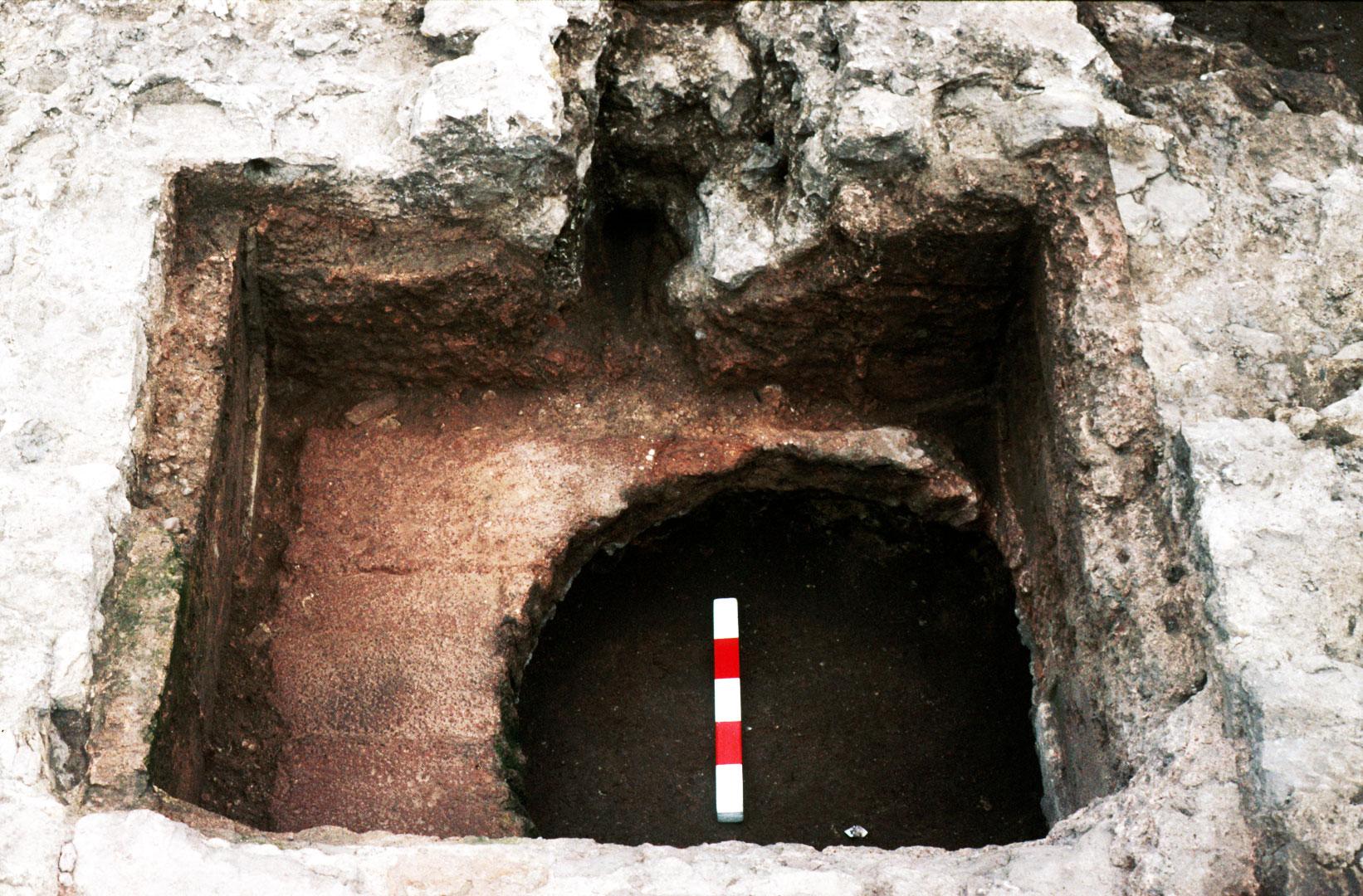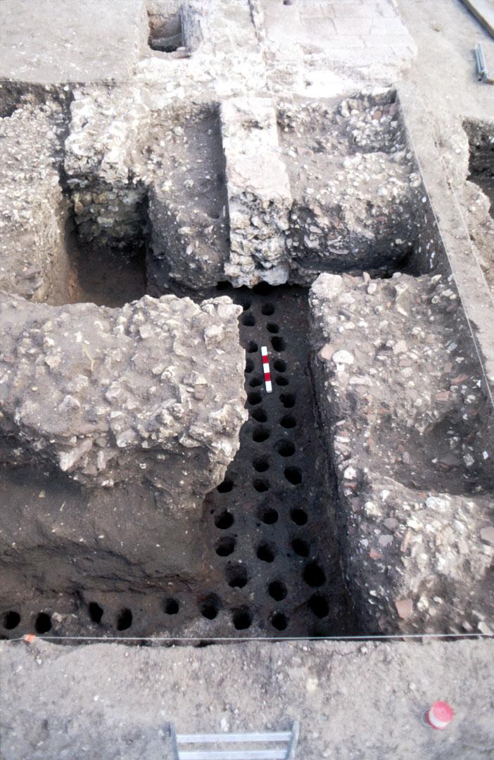 Elle a été précédée d'un décapage sous surveillance archéologique jusqu'aux niveaux d'occupation antiques qui, joint à l'ample phénomène de récupération des matériaux de construction au Moyen Âge, rend problématique la lecture des périodes postérieures.