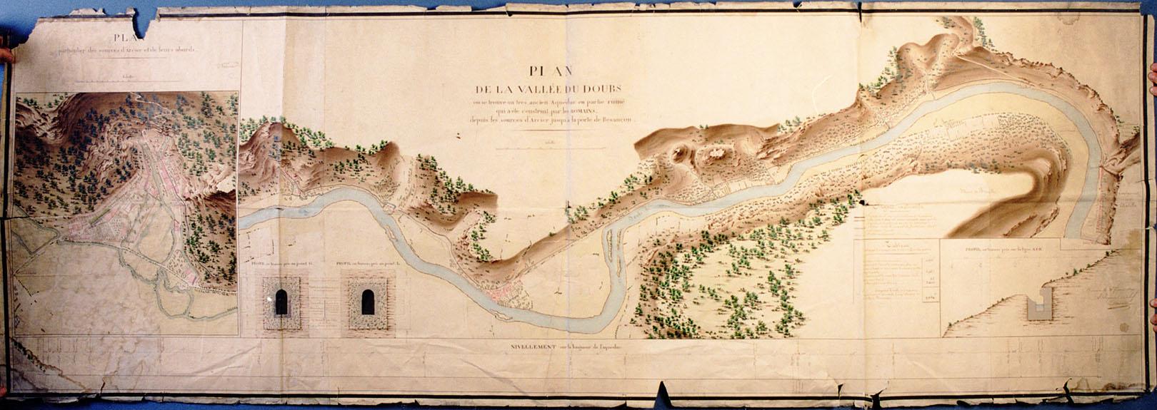 Un tronçon de l'aqueduc traverse l'emprise du chantier, peu avant d'aboutir au castellum divisiorum (bassin de distribution des eaux) voisin, qui distribue l'eau aux fontaines et monuments publics de la ville. L'aqueduc antique d'Arcier est le seul ouvrage de cette importance connu en Franche-Comté. Construit dans le courant du Ier siècle de notre ère, peut-être peu après 70, il reliait les sources d'Arcier à la capitale séquane située à une dizaine de kilomètres en aval. La ville ne possédait pas de source, et celles d'Arcier étaient les seules qui, par leur débit et leur altitude, pouvaient alimenter la ville.