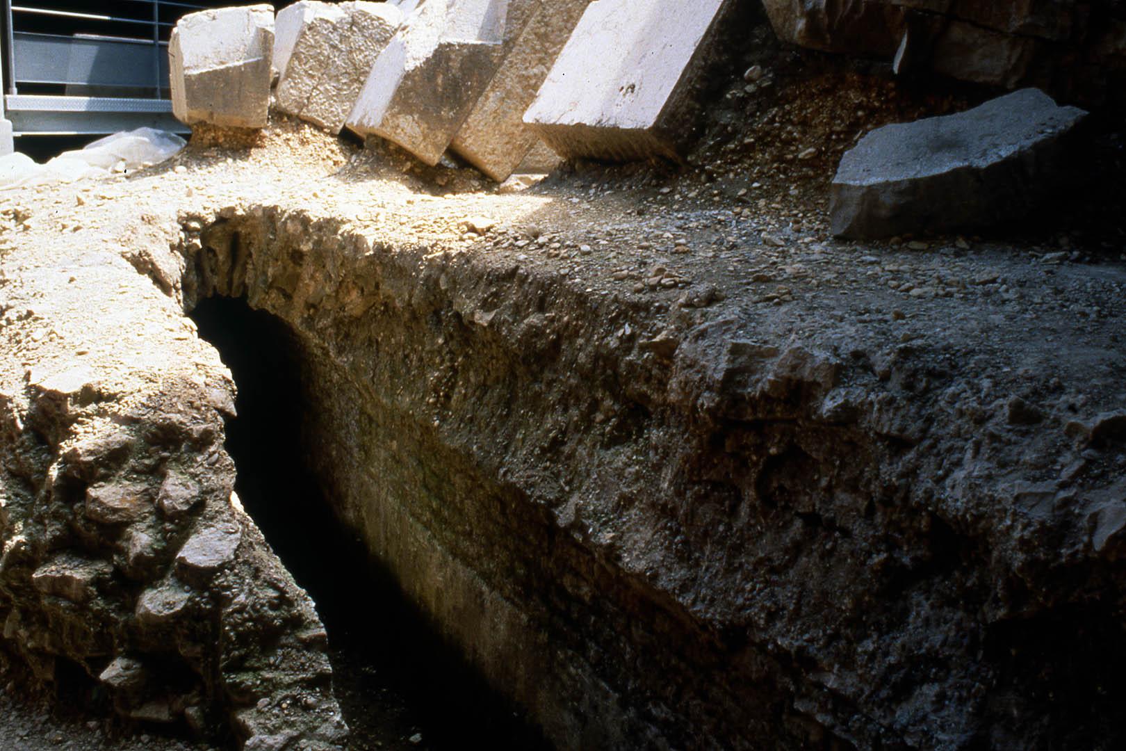 La plus grande partie de la zone fouillée en 1989 est occupée par un édifice construit au-dessus l'aqueduc, dont le tracé à l'intérieur de la ville est souterrain. Ce nouvel édifice vient remplacer le théâtre désormais arasé, et ses énormes maçonneries (4,50 m à la base) constituent vraisemblablement les fondations du podium d'un temple.