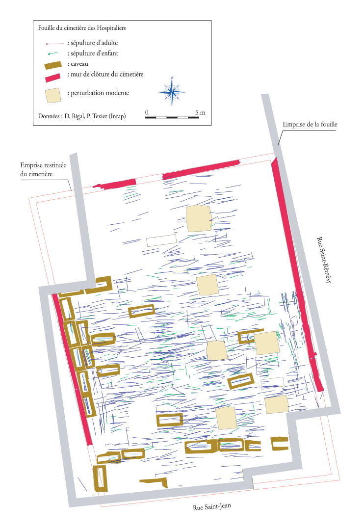 Les 1960 sépultures du XIIe au XVIe siècle recensées sur le site en font l’un des plus importants cimetières fouillés en France. Les hommes représentent 51% des défunts, les femmes 26% et les enfants (0-19 ans) 23%. On dénombre un religieux accompagné du calice et de la patène, quatre soldats inhumés avec des dagues ou des faucilles, cent soixante-et-onze pèlerins (11%) identifiables par quatre sportelles, cinquante-trois bâtons ferrés et deux cent trente-six coquilles. Parmi ces derniers, 75% sont des hommes, 23% des femmes et 2% des adolescents.