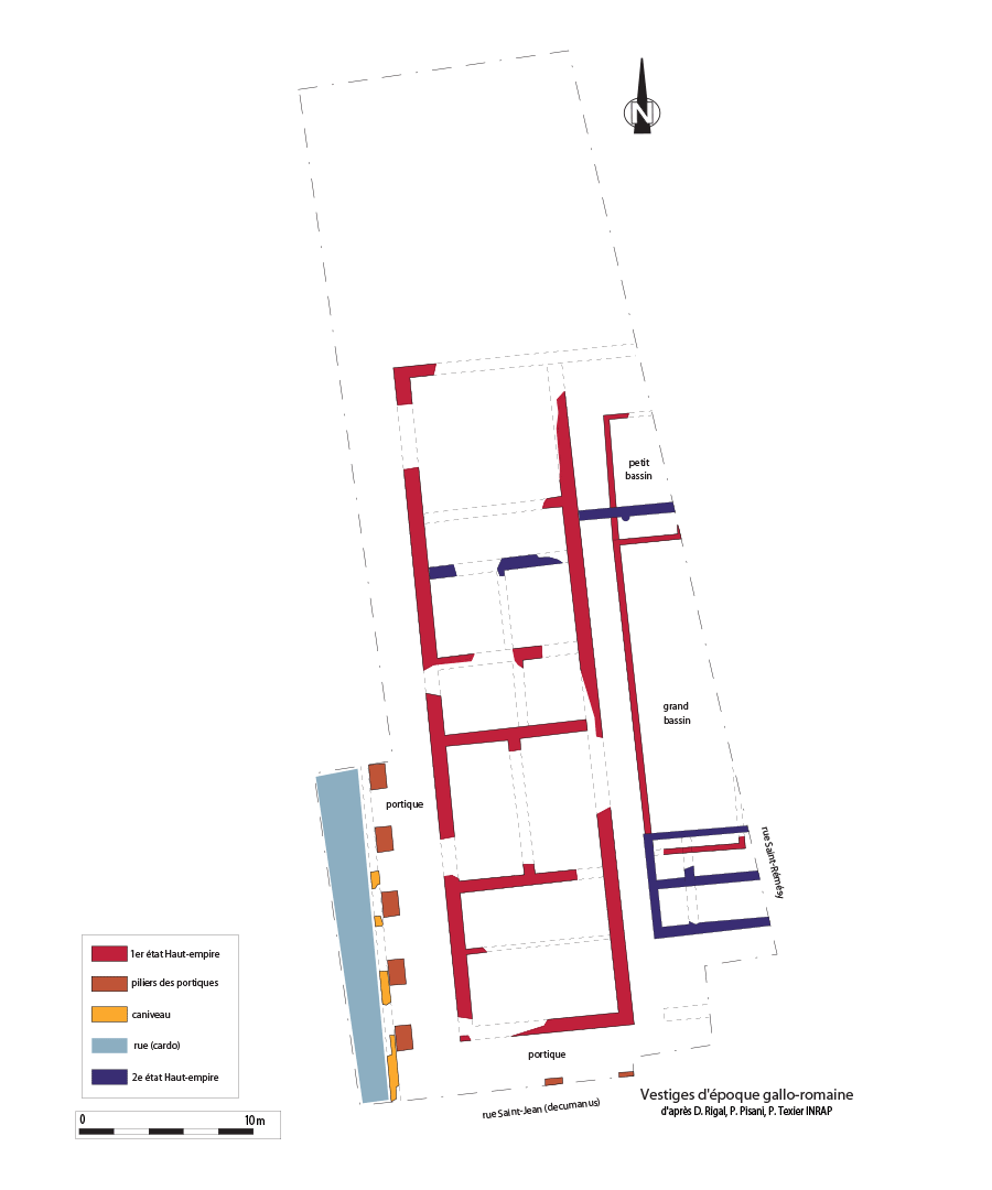 En dépit de l’installation du cimetière médiéval, les vestiges gallo-romains présents sur le site depuis le début du Ier siècle se sont bien conservés. L’emprise de la fouille a permis de distinguer le plan partiel d’un bâtiment agrémenté de bassins étagés, dont la qualité de construction est indéniable. Les sols sont réalisés en mortier de chaux, de tuileau ou en terre battue. Sur les bordures sud et ouest, une galerie large de 3 m permet la circulation des piétons dans un espace couvert. Ce portique est bordé par un cardo (axe nord-sud) et un decumanus (axe est-ouest) dont les bordures ont été reconnues. C’est aussi là qu’un dolium (grande jarre en terre cuite) a été enterré, pour servir de réserve d’eau ou de latrines. Le plan partiel du bâtiment et les éléments mobiliers qui y ont été découverts (vaisselle céramique, objets de toilette…) suggèrent l’appartenance à une résidence urbaine (domus) comportant un ou plusieurs étages.