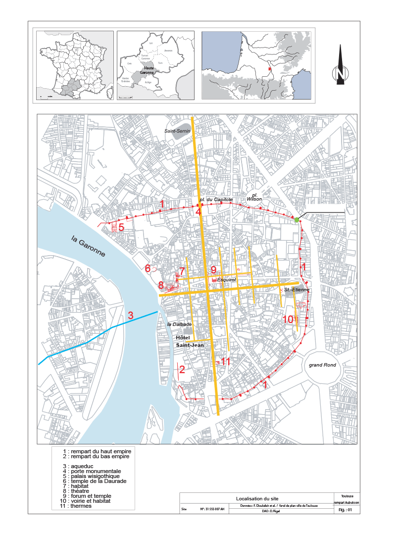 Dans le centre de Toulouse, le site de l’Hôtel Saint-Jean a été fouillé sur une épaisseur de 3,5 m et sur une emprise de 1 500 m², ce qui a généré des découvertes majeures correspondant à trois grandes phases.