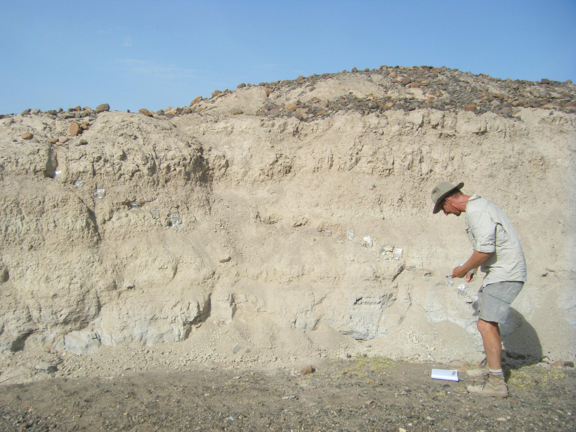 Xavier Boes (géologue à l’INRAP) devant une coupe géologique lacustre vieille de 2.4 Millions d‘années en cours d’échantillonnage (2018).