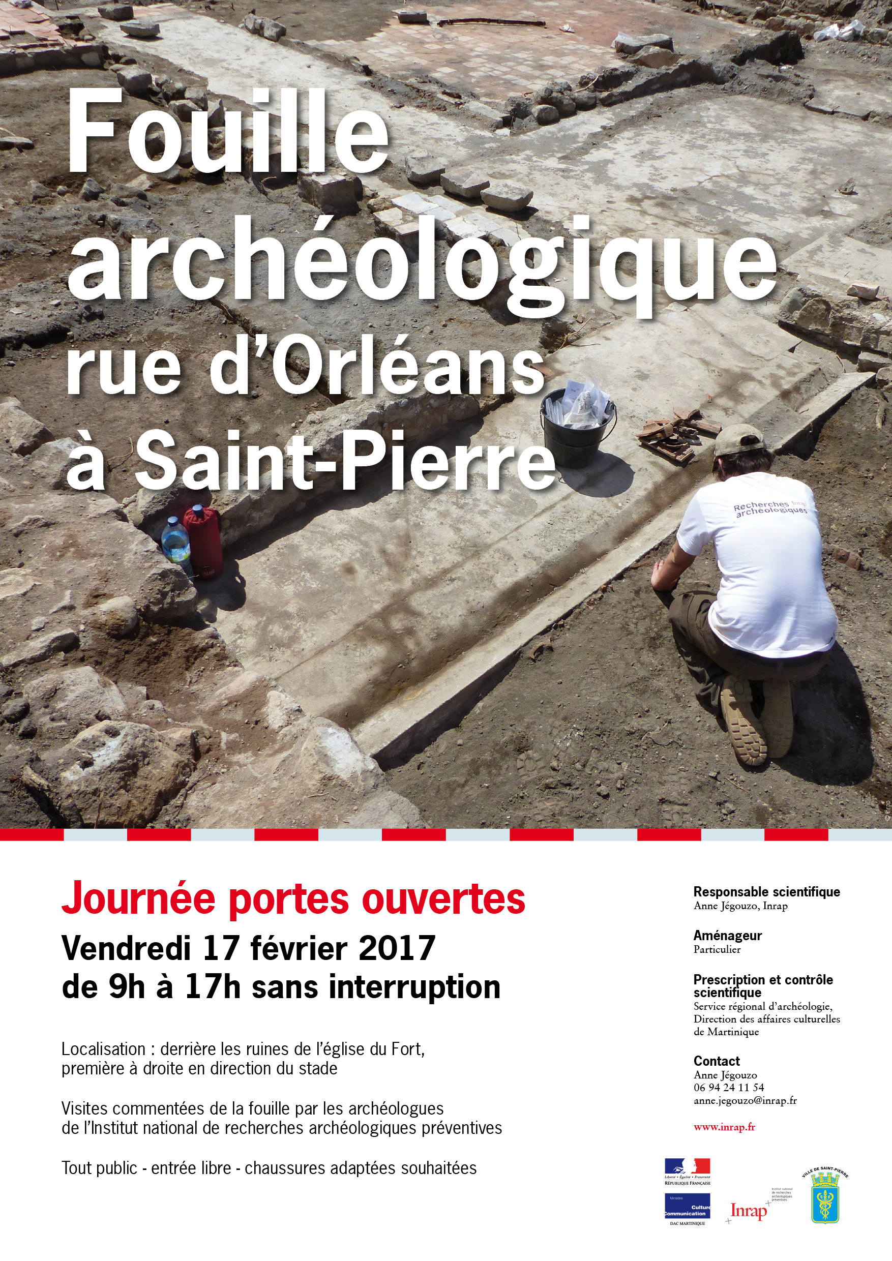 À partir du 23 janvier et jusqu'à début mars 2017, une fouille archéologique préventive est mise en oeuvre à Saint-Pierre préalablement à la réalisation d'un projet de construction. Prescrite par le service régional de l'Archéologie de la direction des Affaires culturelles et réalisée par une équipe de l'Inrap, cette fouille concerne un ensemble de bâtiments civils correspondant à une phase d'urbanisation de la cité au cours des XVIIIe et XIXe siècles et qui furent détruits par l'éruption du 8 mai 1902 (vue des sols, murs et bassin d'une maison détruite en 1902).