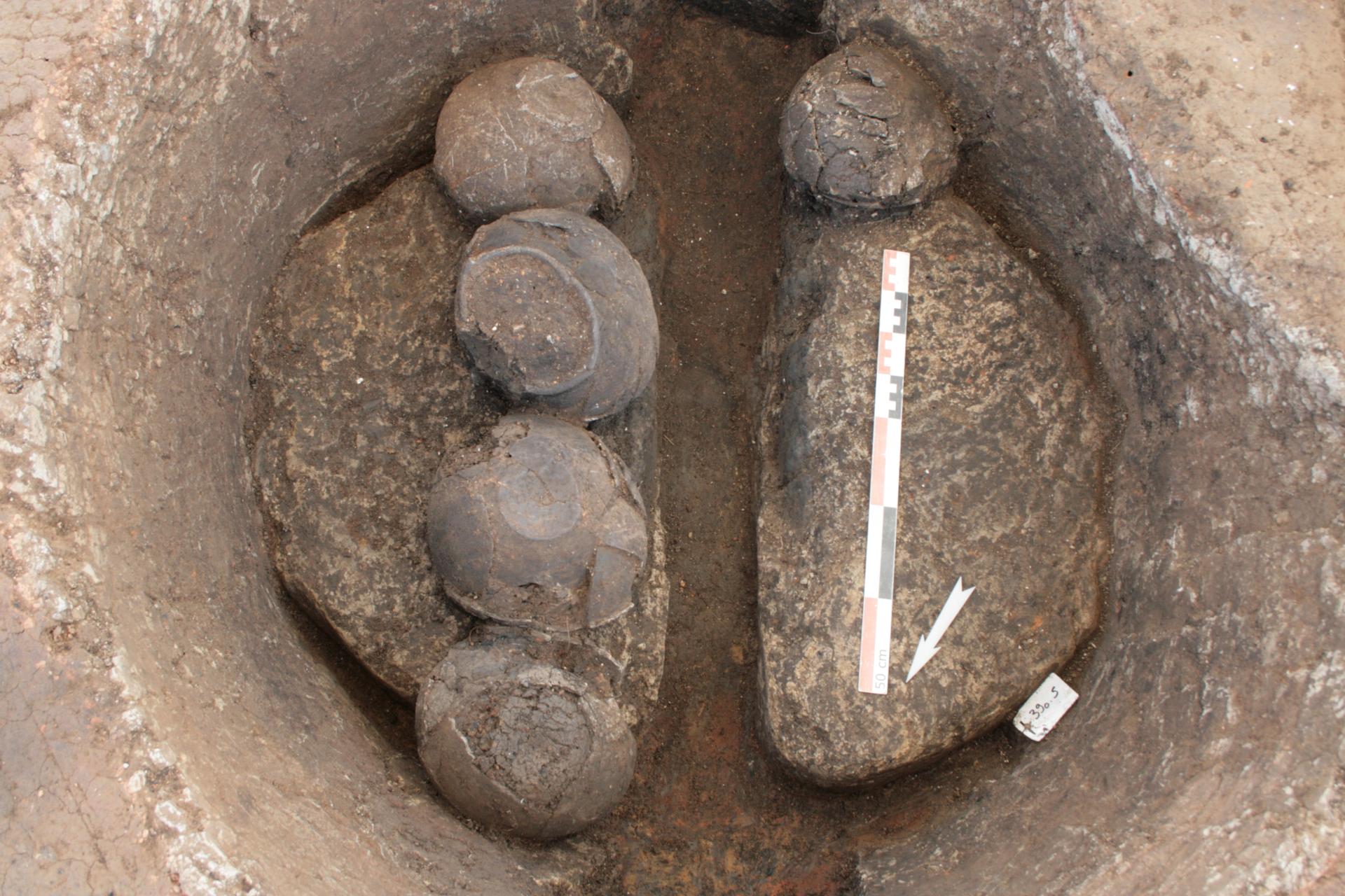 Dépôt de vases ? Dans ce four, une trentaine de vases ont été déposés avec soin dans le four. On pense à un geste de condamnation car les récipients fragiles n’ont pas été balancés mais posés les uns sur les autres.