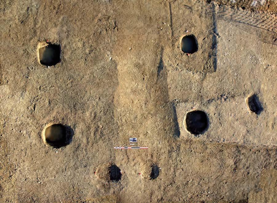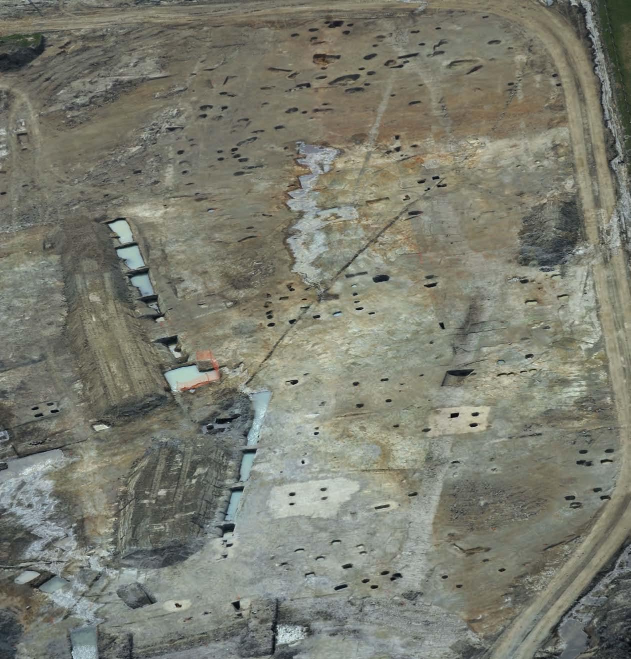 Sur l'ensemble de la zone étudiée aujourd'hui (4 ha), une quarantaine de bâtiments a été découverte. Il n'en reste que les fondations, matérialisées par des trous de poteau creusés dans le sol. La distribution spatiale ordonnée, associée à la régularité des modules employés pour les architectures, confirme l'idée d'espaces lotis parfois délimités au sol par de petits fossés/talus.