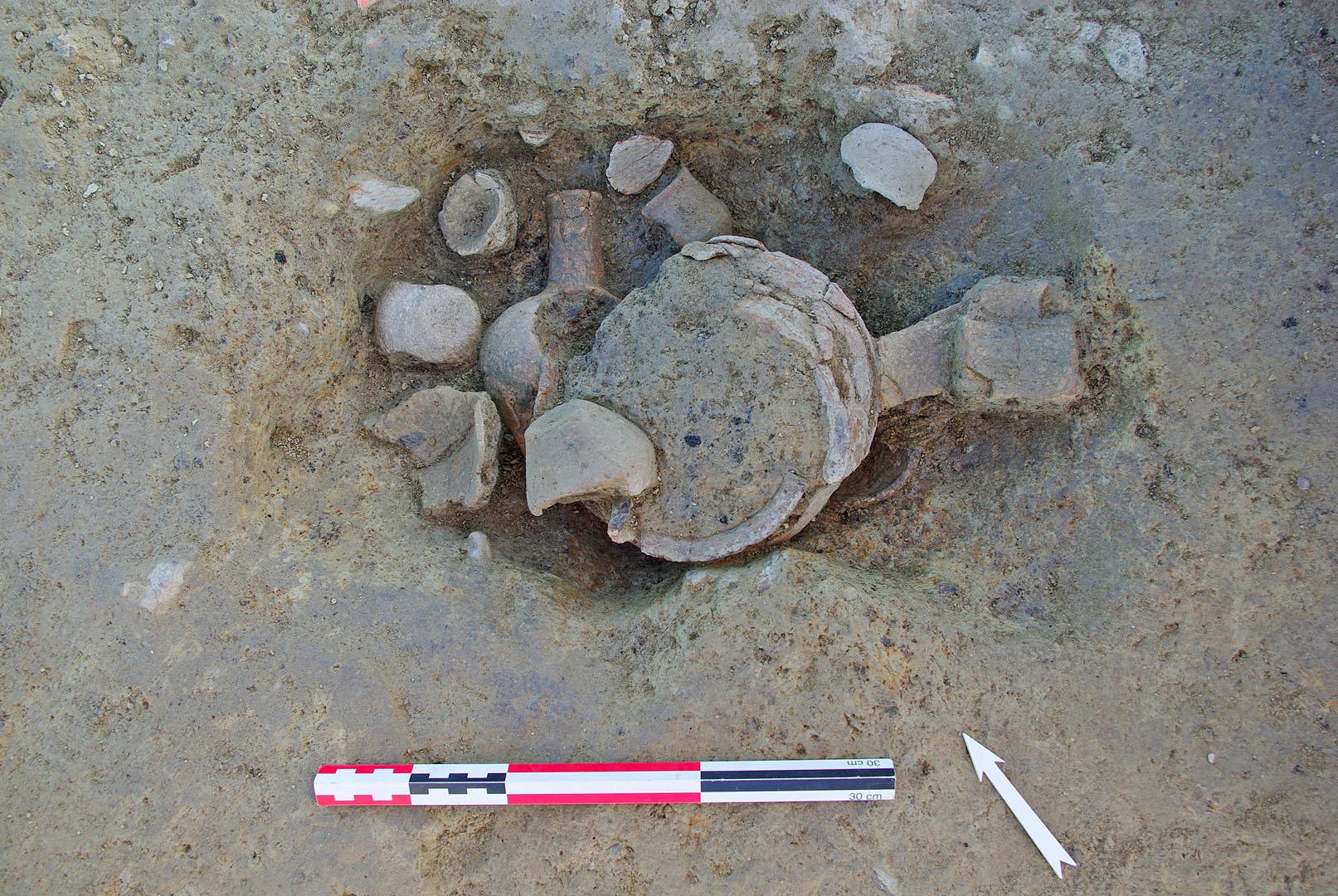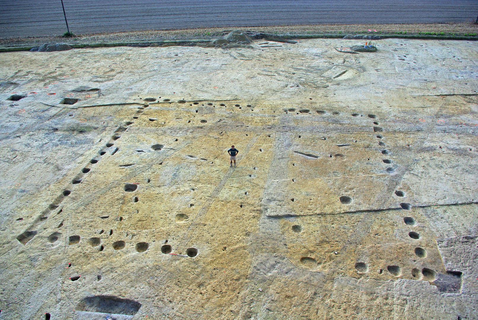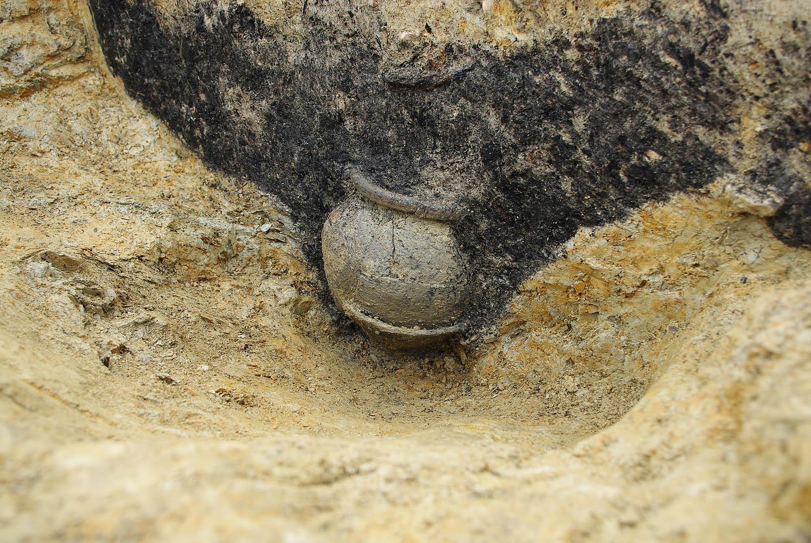 Les indices d'occupation les plus anciens sont une fosse dont le comblement contient une céramique attribuable à l'âge du Bronze. Le plan d'un bâtiment circulaire sur poteaux, situé à environ 80 m de là, évoque également un type d'architecture de la même époque.