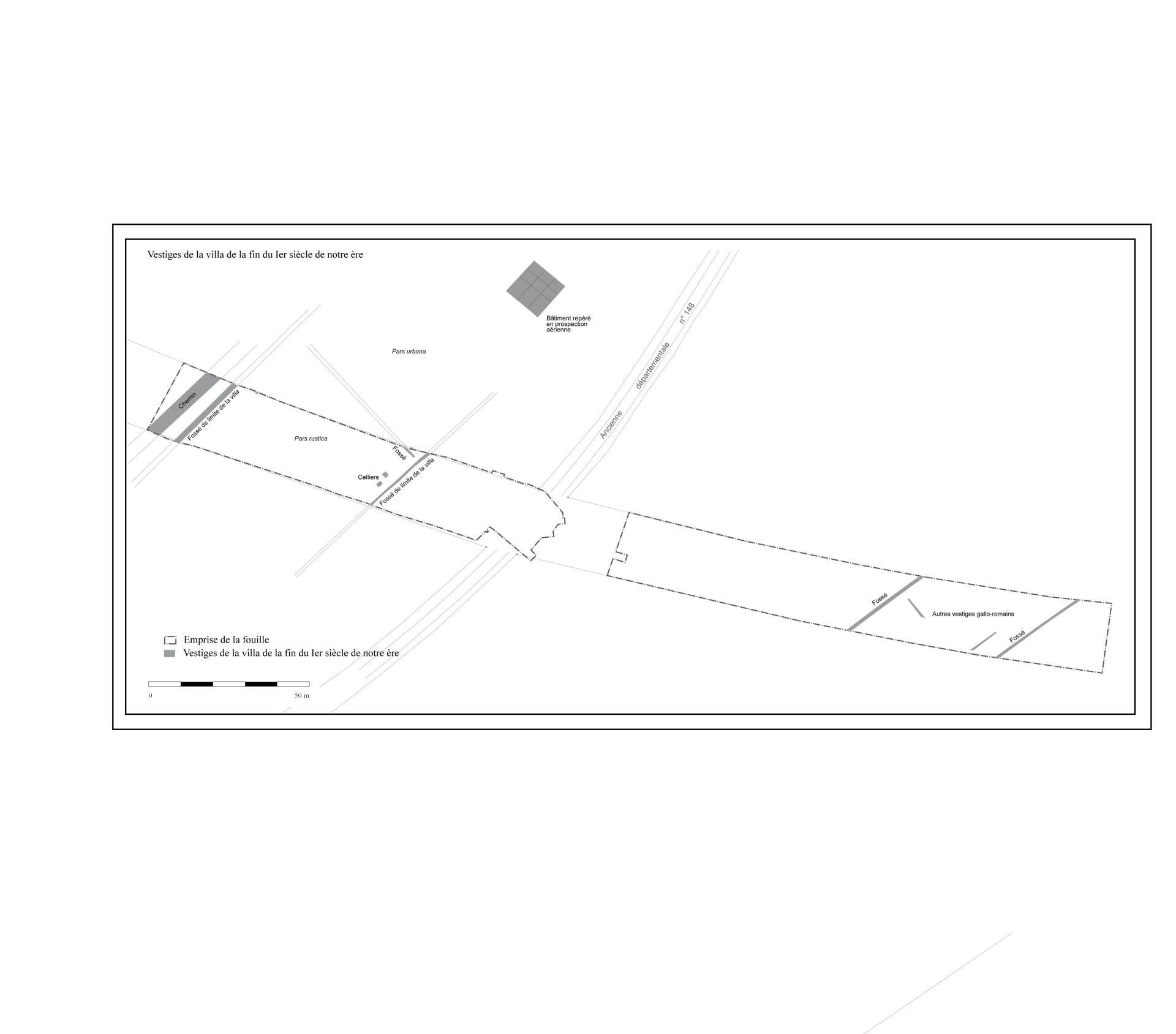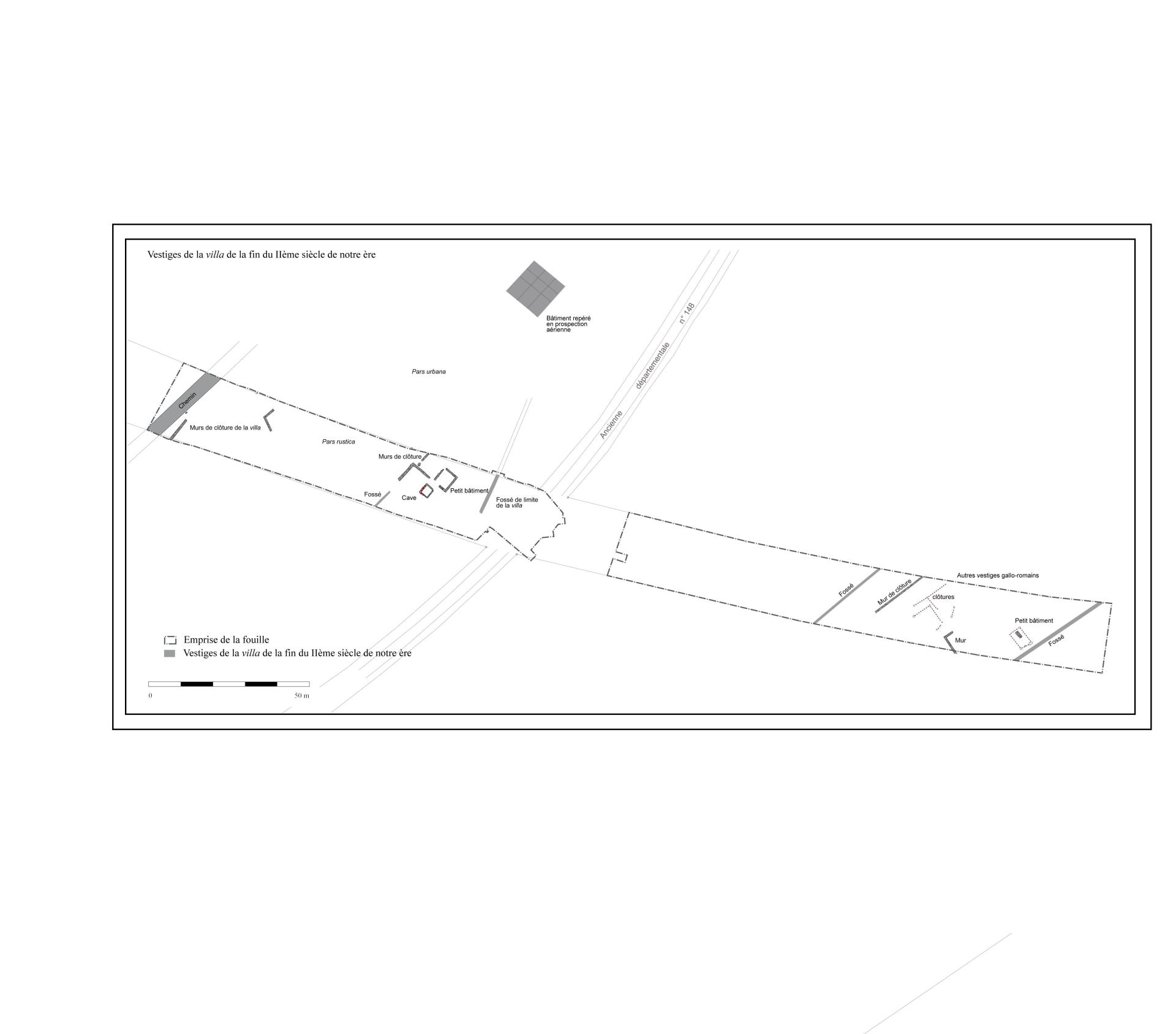 Les fouilles ont révélé la présence de fossés, fosses, murs de clôture, bâtiments en terre et pierre, celliers enterrés et cave. L'étude des vestiges nous montre qu'un premier établissement a été construit dans le courant du Ier siècle de notre ère. L'espace, limité par des fossés, s'organise en deux pôles : d'une part, la résidence, et d'autre part, les installations liées aux activités agricoles. Cette répartition caractérise une villa gallo-romaine : pars urbana d'un côté, pars rustica d'un autre.