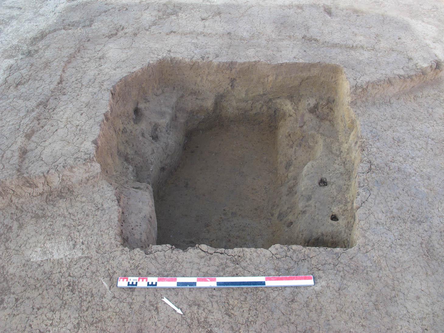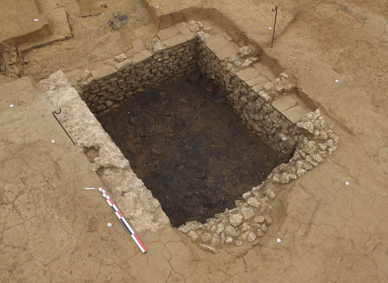 Les traces des pieds du métier à tisser sont visibles au centre ainsi que la partie piétinée par le tisserand. Les empreintes peuvent correspondre à un métier horizontal de 1,70 m de large pour 1 m de profondeur. Un poinçon et une broche à tisser en os ont été retrouvés sur le sol.