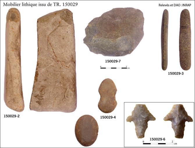 Le mobilier lithique est essentiellement représenté par une armature à pédoncule (une pointe de flèche avec des rebords en forme de pied), un petit polissoir dont la partie distale (le bord le plus fin) a été biseautée, un fragment de meule particulièrement « mince », quelques outils sur galets de quartzite de type nucléus, ou percuteur, un polissoir, un éclat de silex brûlé et quelques éclats de débitage. Sur le plan chronologique, on peut globalement attribuer cette série de mobilier aux périodes du Néolithique, voire au tout début des âges du Bronze.