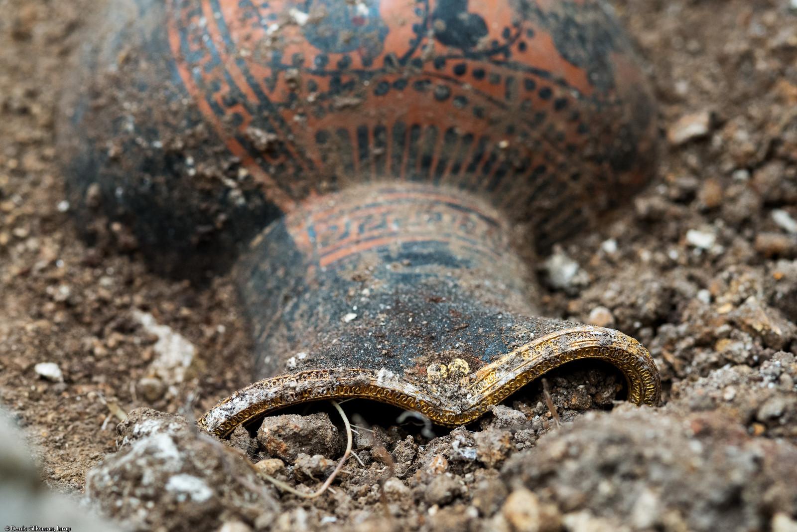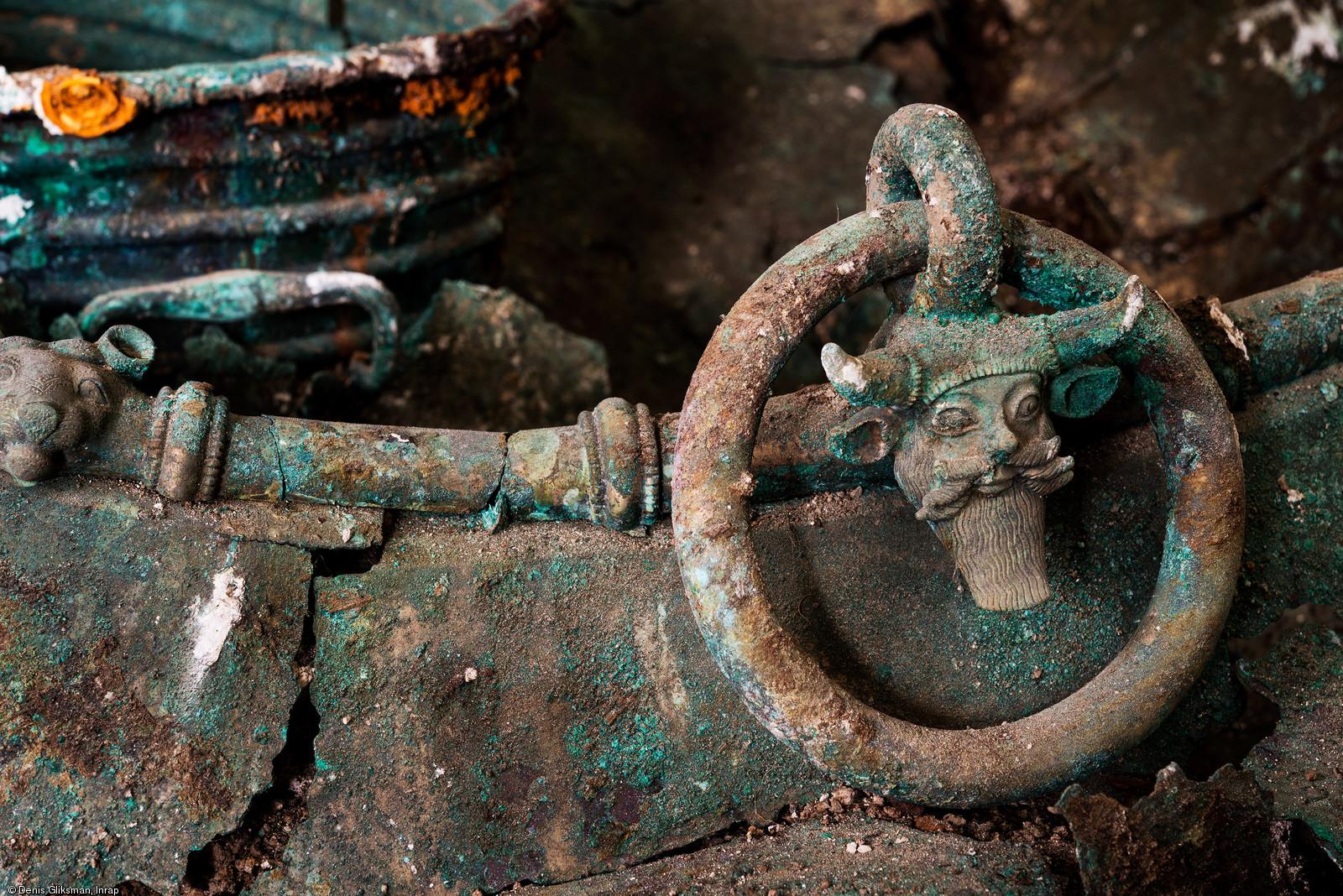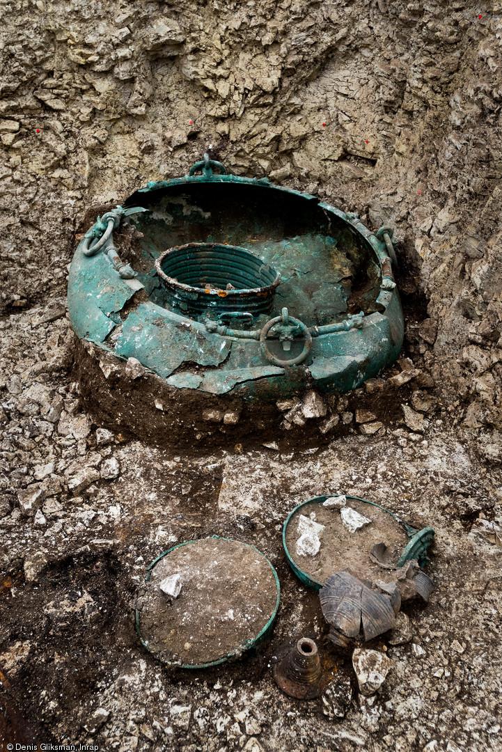 Exhumée par une équipe d'archéologues de l'Inrap, la tombe princière de Lavau, datée du début du Ve siècle avant notre ère, a révélé un mobilier funéraire exceptionnel : chaudron en bronze méditerranéen à têtes de lionnes et d'Acheloos (dieu-fleuve), oenochoé attique à figures noires, ciste, bassins en bronze etc.