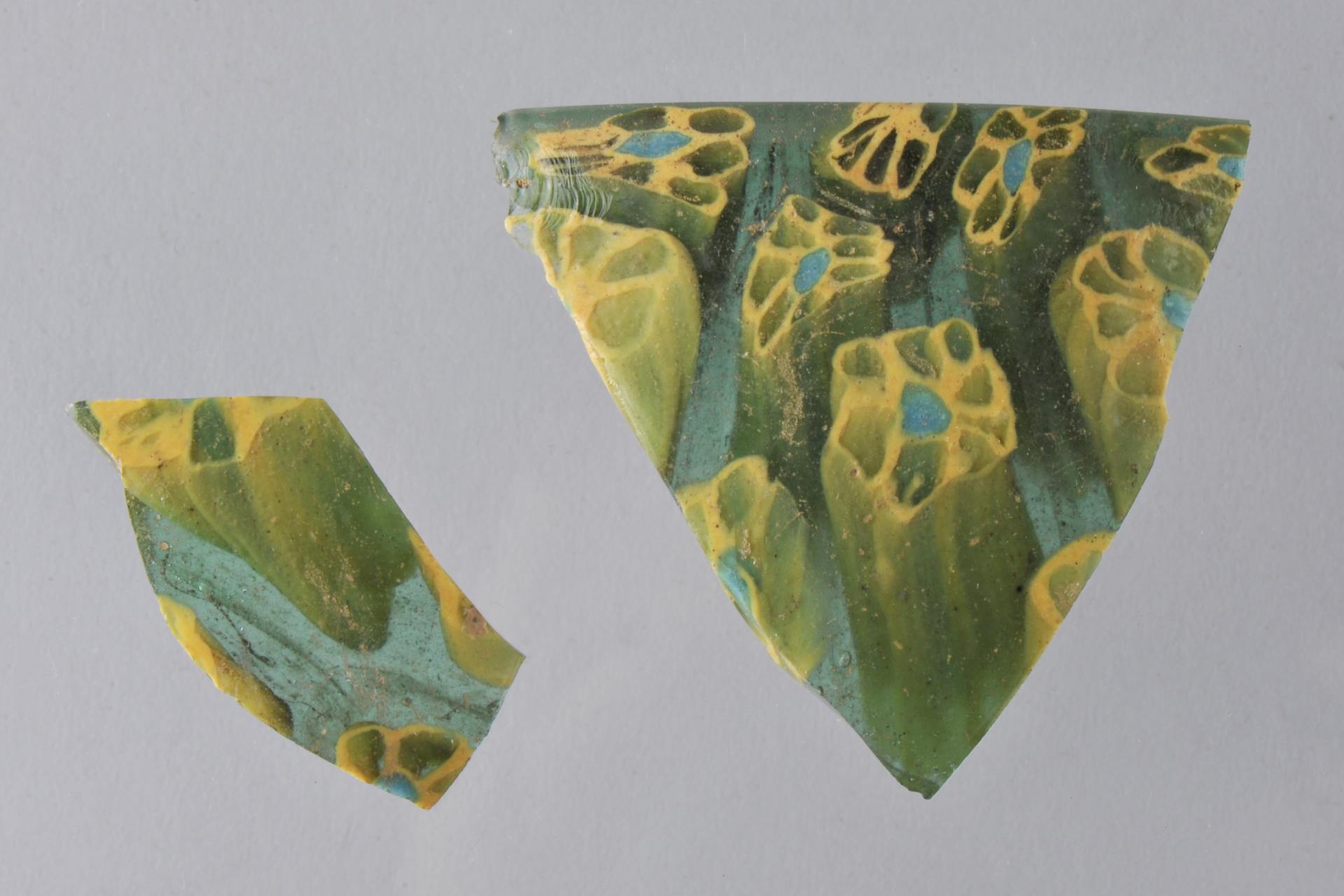 Fragments de verre dit « millefori » ou verre mosaïqué d’origine italienne.