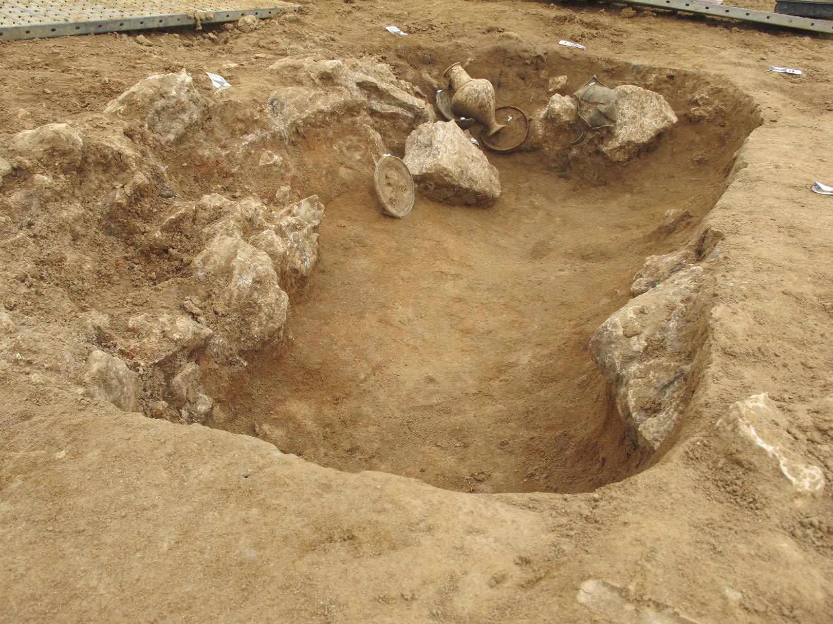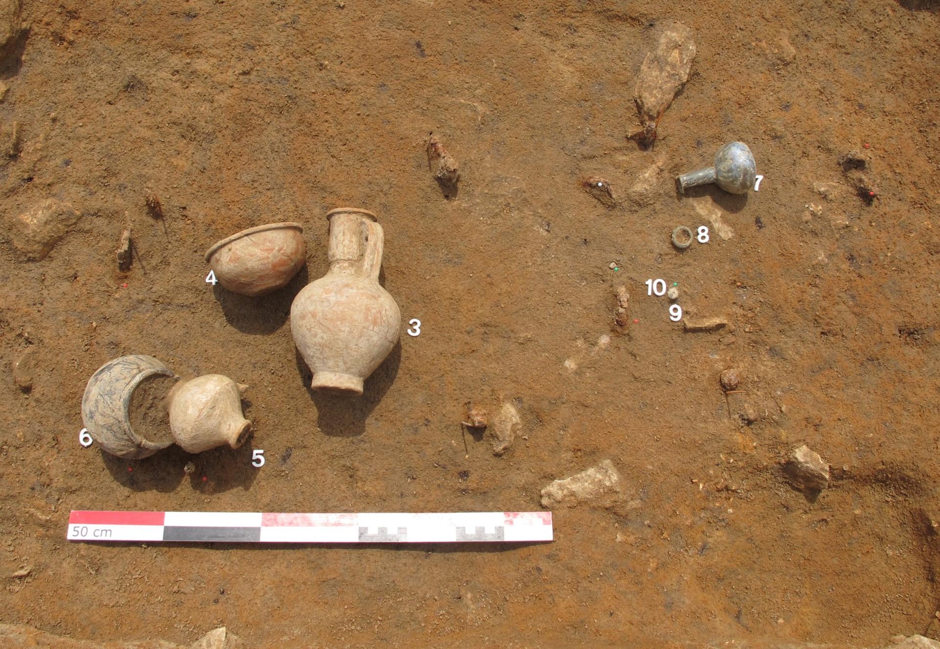 Les défunts sont accompagnés de nombreux objets, parfois installés sur des supports en bois agencés dans la tombe. Les vases en terre cuite constituent la majorité des dépôts : cruches, gobelets, assiettes, pots... Les tombes d'enfants se caractérisent par des poteries spécifiques, modèles réduits de céramiques de service ou biberons.