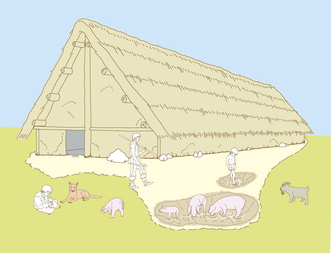 Bien plus tard, vers 5500 avant notre ère, les migrants néolithiques danubiens atteignent l’Europe de l’ouest : ils y érigent de longues maisons de terre et de bois, quasiment identiques dans toute l’Europe centrale et occidentale. Il s’agit dans un premier temps de petits hameaux de deux ou trois maisons, dispersés le long des cours d’eau. Puis, petit à petit, les villages s’étendent et se multiplient, l’architecture se diversifie.