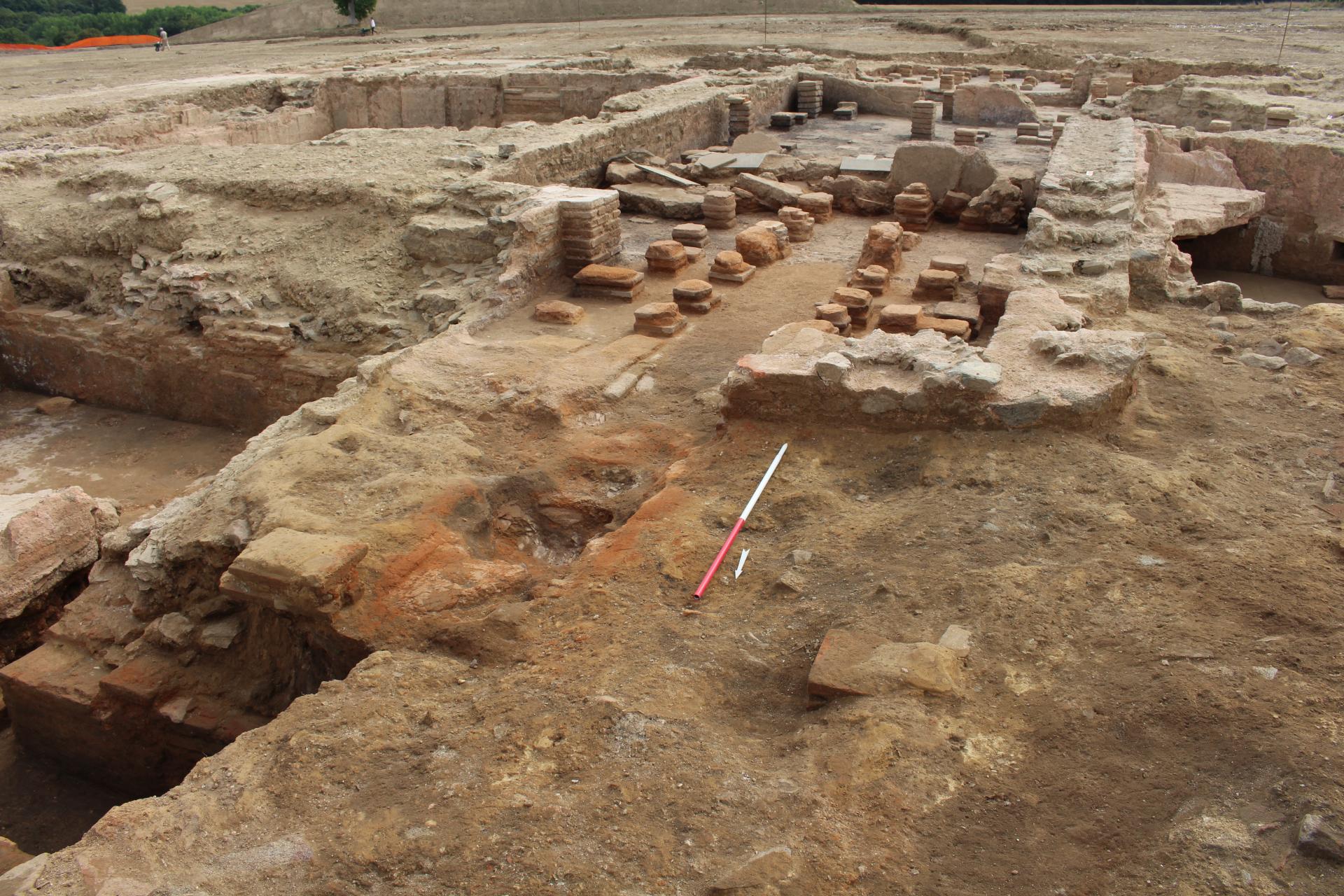 Vue d’ensemble des thermes en cours de fouille. Au premierplan, les salles chauffées par le sol