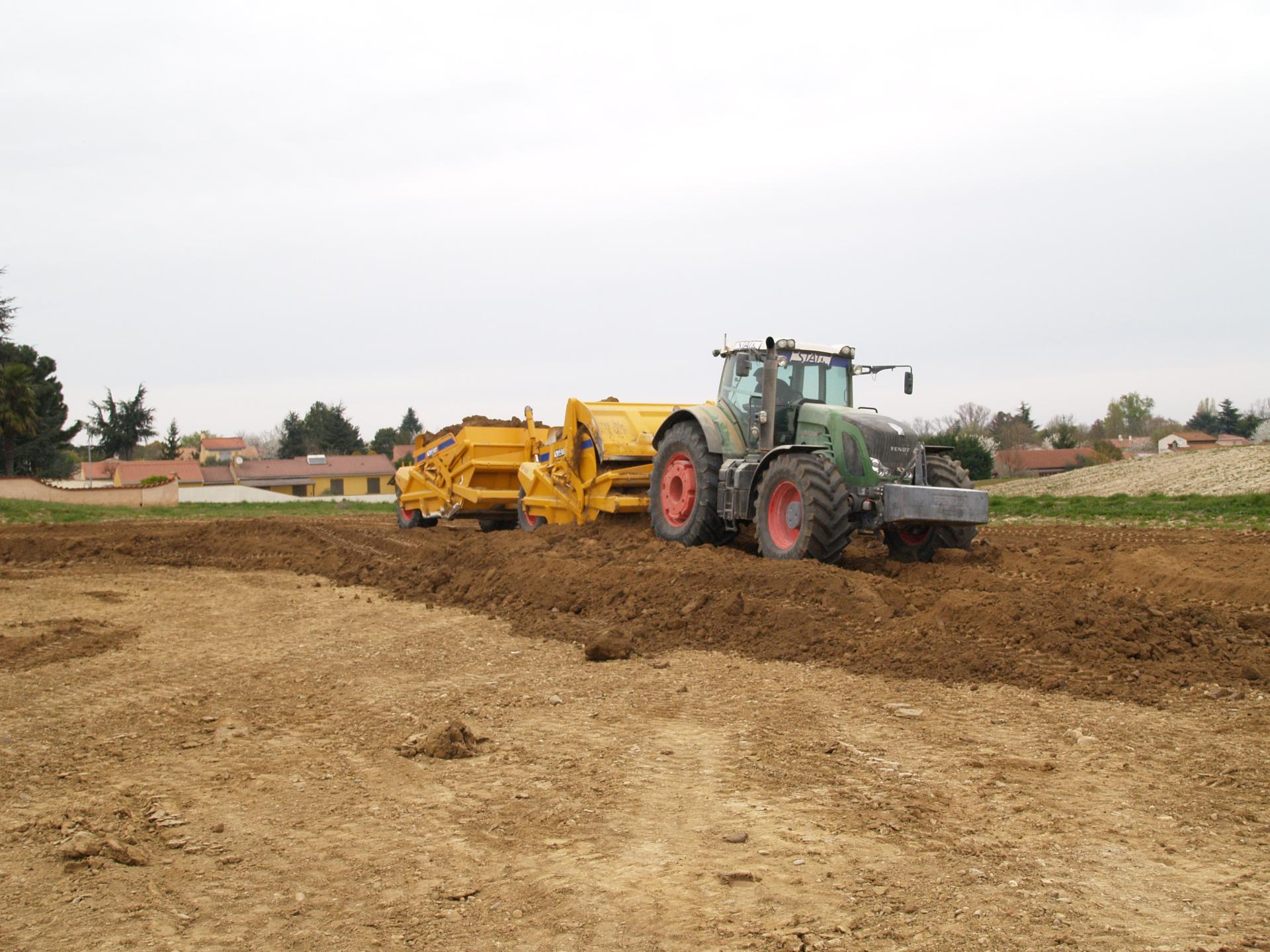 Remblaiement de fouille par décapeuse tractée à Blagnac (Haute-Garonne).